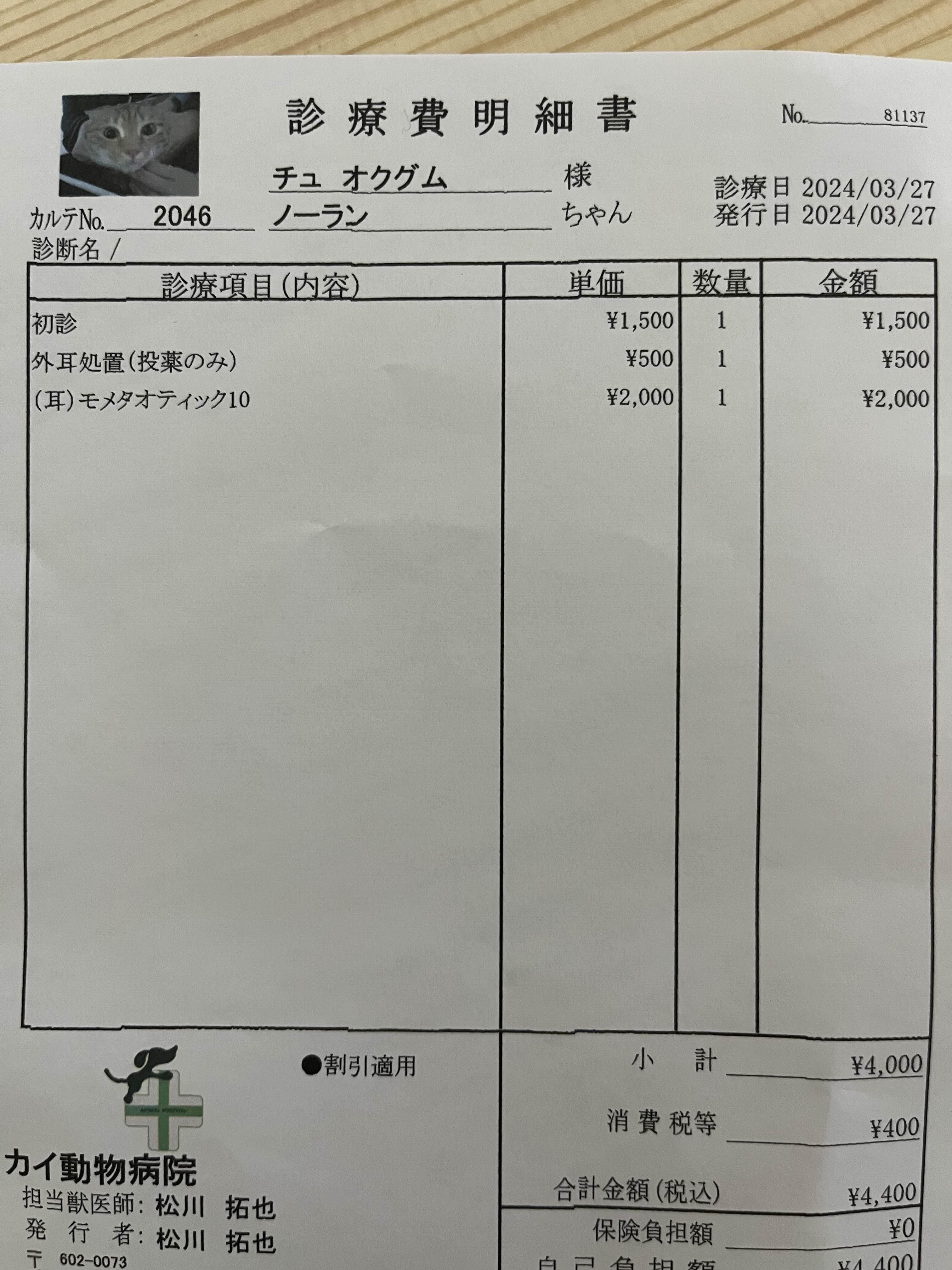 노랑이도 일본 동물병원 경험했다. 병명은 또 외이도염이다.
