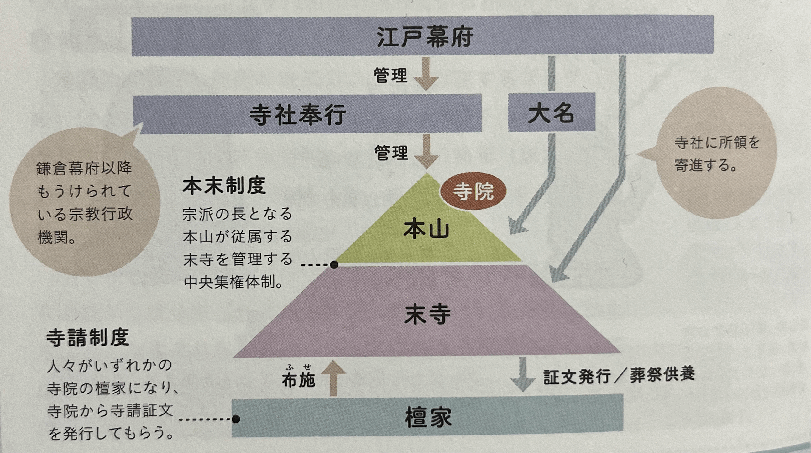 도쿠가와 이에야스에 의해서도 종교정책은 큰 과제였다. 에도 막부는 본말 제도를 도입해 사원을 지배했다. 나아가 이 구조를 이용해 사람들을 통치했다.