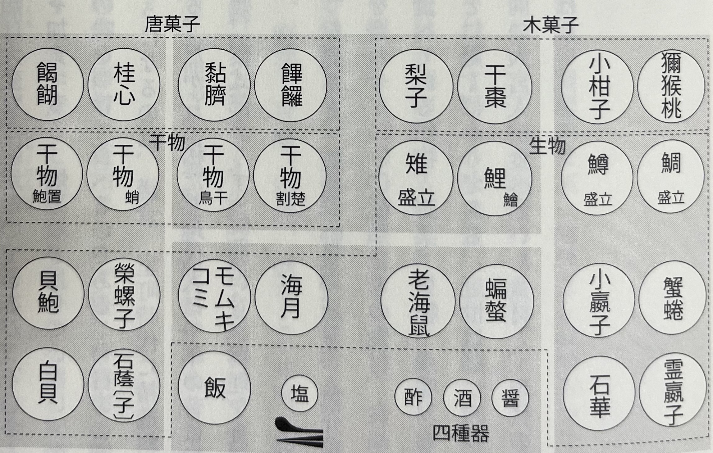 이 3헌의 의례가 끝나면 밥과 국이 운반되어 와 향연으로 넘어간다. 향연의 요리를 설명하자면, 먼저 손님 앞에 밥을 수북히 담은 사발과 젓가락, 숟가락을 놓고 소금, 식초, 술, 간장을 담은 작은 접시를 늘어놓는다. 그 너머에 와배窪杯라는 깊은 그릇에 담긴 해파리, 멍게, 모무키코미(새 내장의 소금절임), 편석蝙螫(도미 젓갈)을 늘어놓는다. 좌우에는 꿩고기, 잉어, 송어, 도미의 회, 전복, 소라, 백합, 말똥성게(石蔭子), 고둥, 게, 성게 등의 날것과 전복, 문어, 작은 새, 생선살 말린 것을 놓는다. 다이반의 건너편에는 목과자(말린 과일)과 당과자(밀가루나 쌀가루를 반죽해 기름에 튀긴 중국풍 쿠키)를 몇 종류씩 늘어놓는다. 요리의 가짓수는 손님의 신분에 따라 달라, 왕족 등에게는 20품목의 요리와 8품목의 과자, 합하여 28품목이 제공되며, 배석하는 공경에게는 20품목, 소납언少納言 등 관료층에게는 12품목이다.