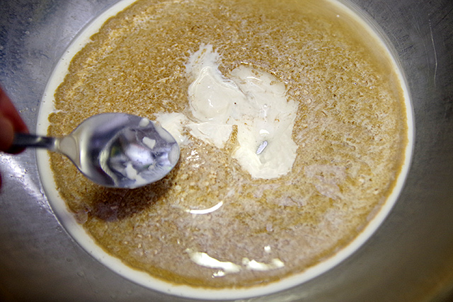 그럼 그걸 잘 긁어모아 설탕과 섞고.