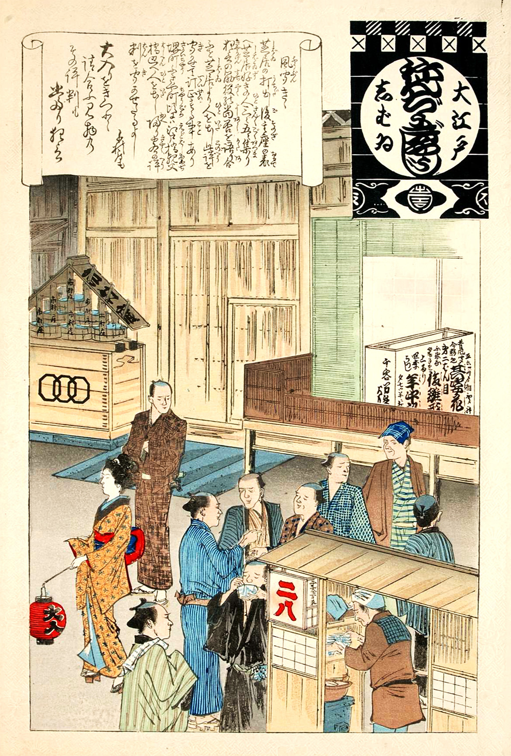 이윽고 현재의 나가노현 시오지리시塩尻市의 모토야마쥬쿠本山宿 또는 야마나시현의 야마토손大和村에서 메밀을 늘여서 자르는 제법이 고안해 냈습니다. 그것이 에도에도 전해져, 17세기에는 메밀가루 80%에 대해 찰기 보충 재료를 20% 섞은 '28 메밀국수'가 정착합니다. 이 메밀국수가 멋을 사랑하는 에도 사람이 즐겨 먹을 수 있게 되었기 때문에, 메밀국수는 세련된 먹을거리로 펴졌습니다.
