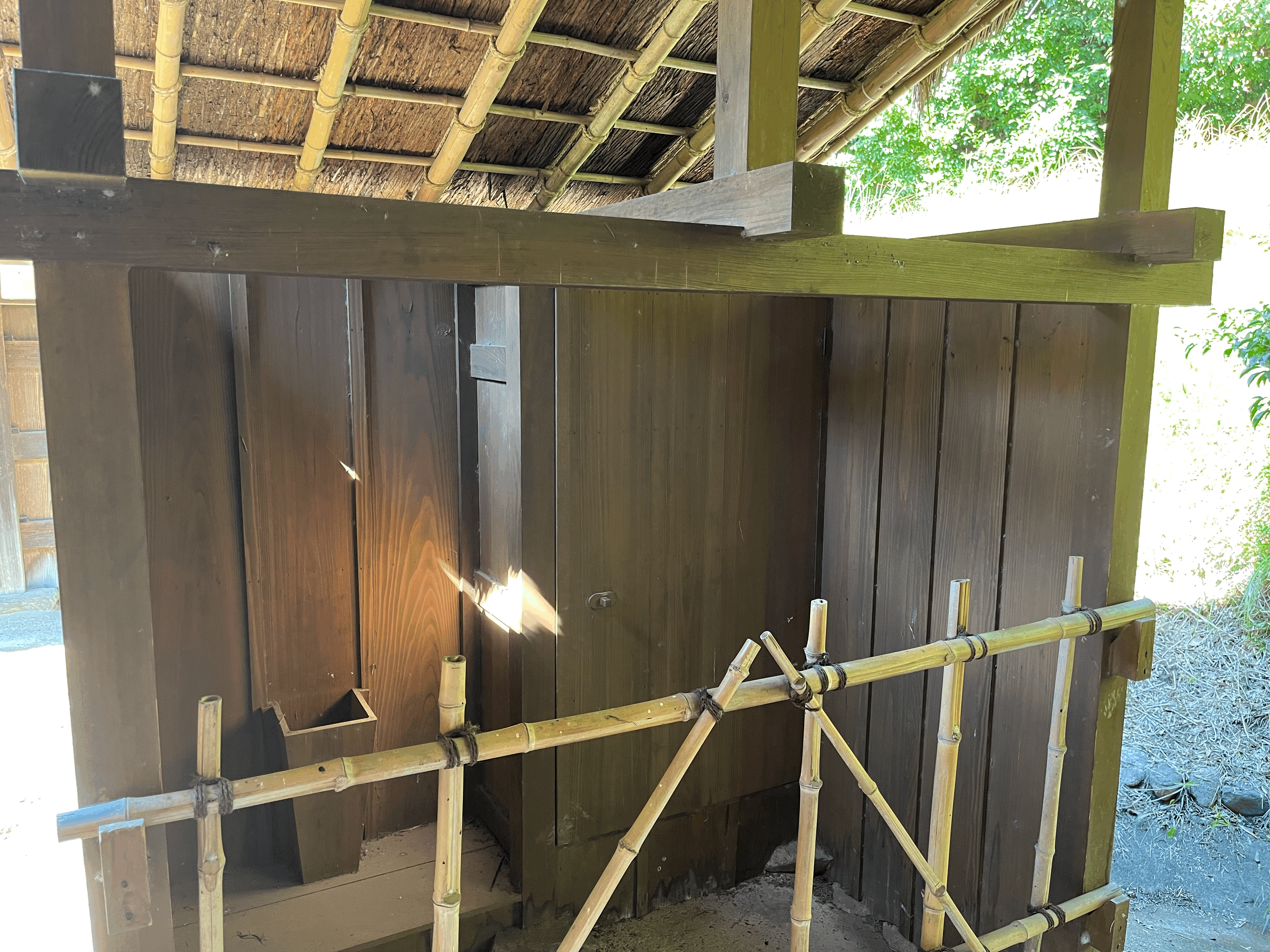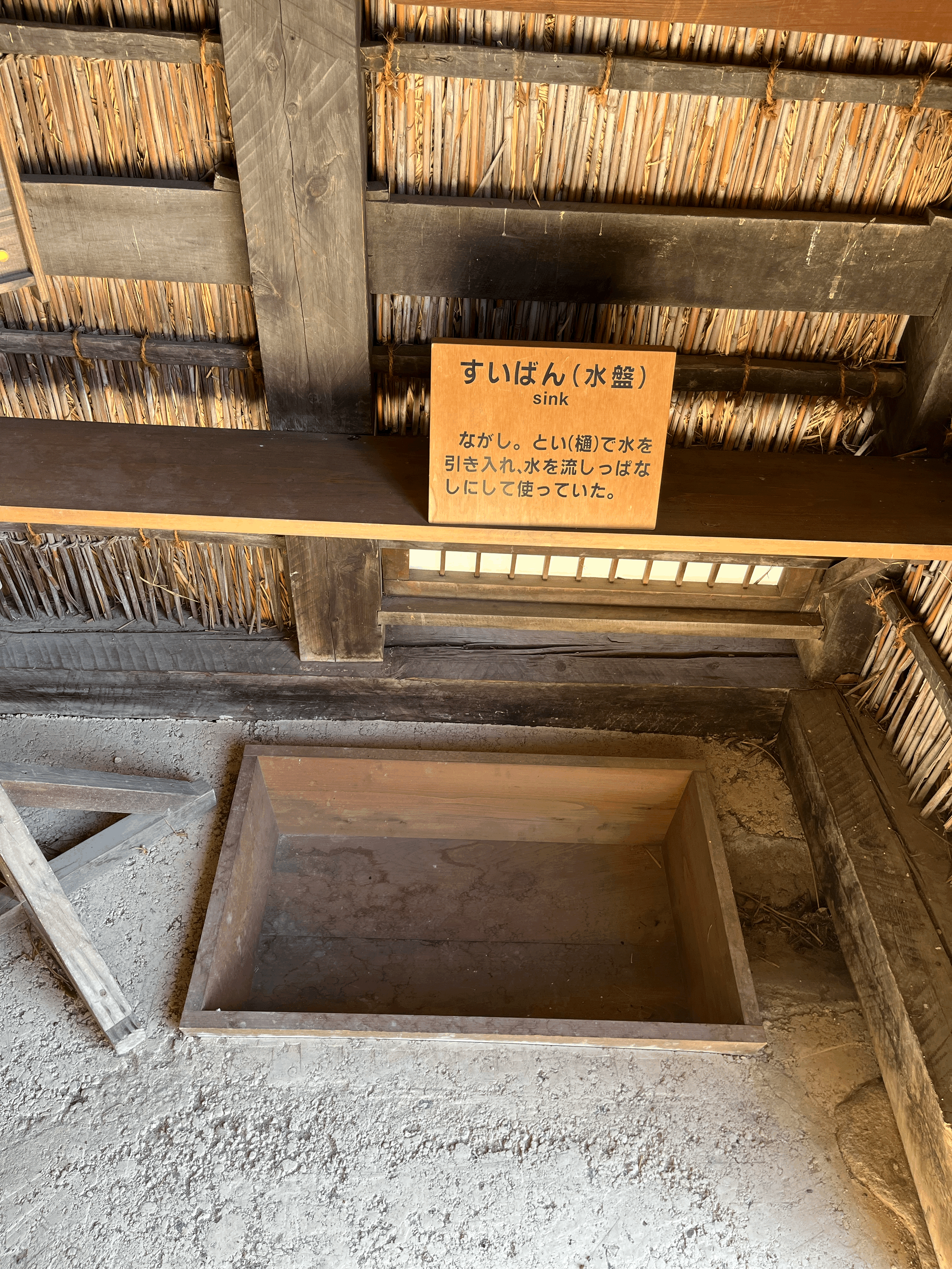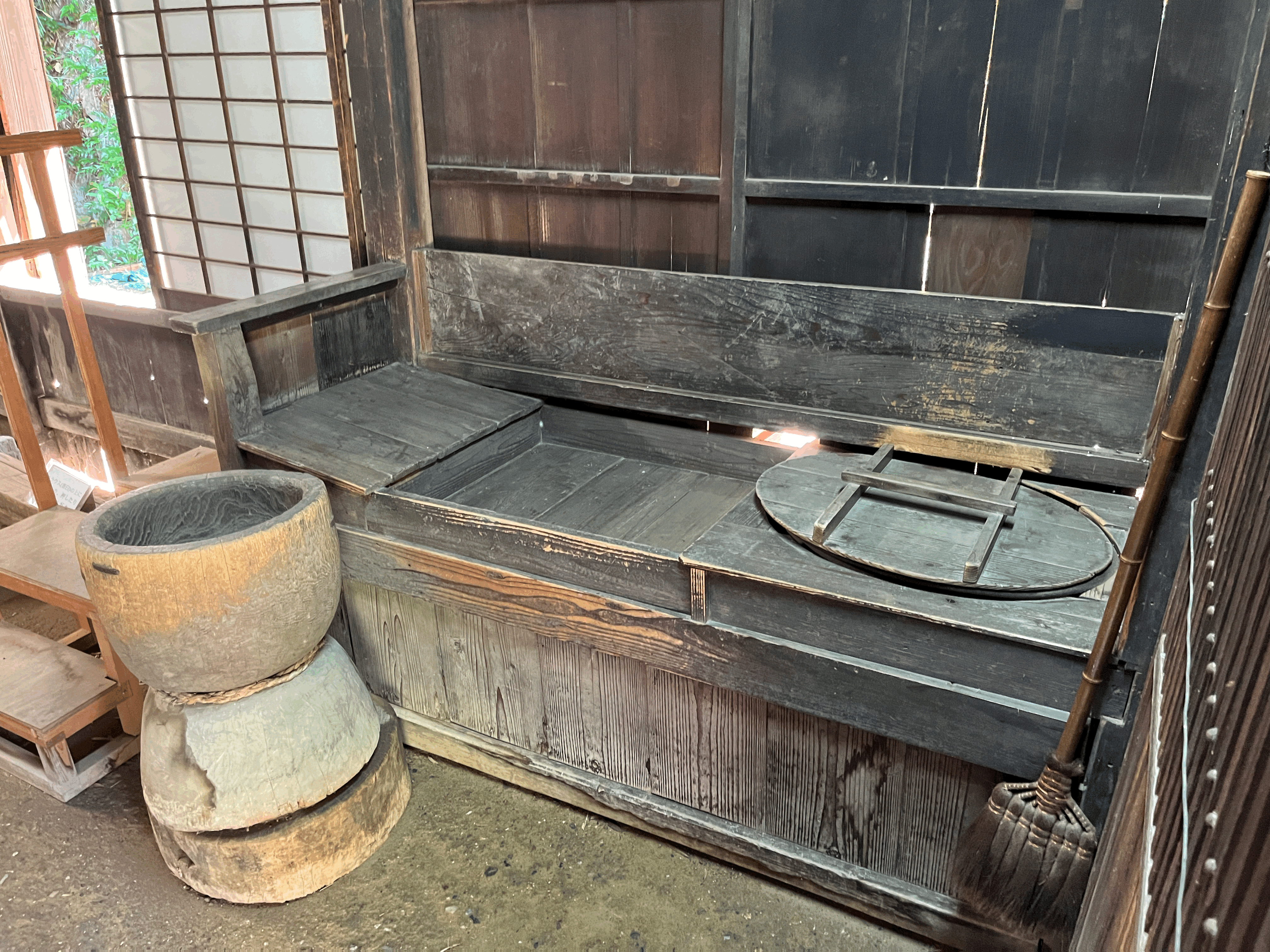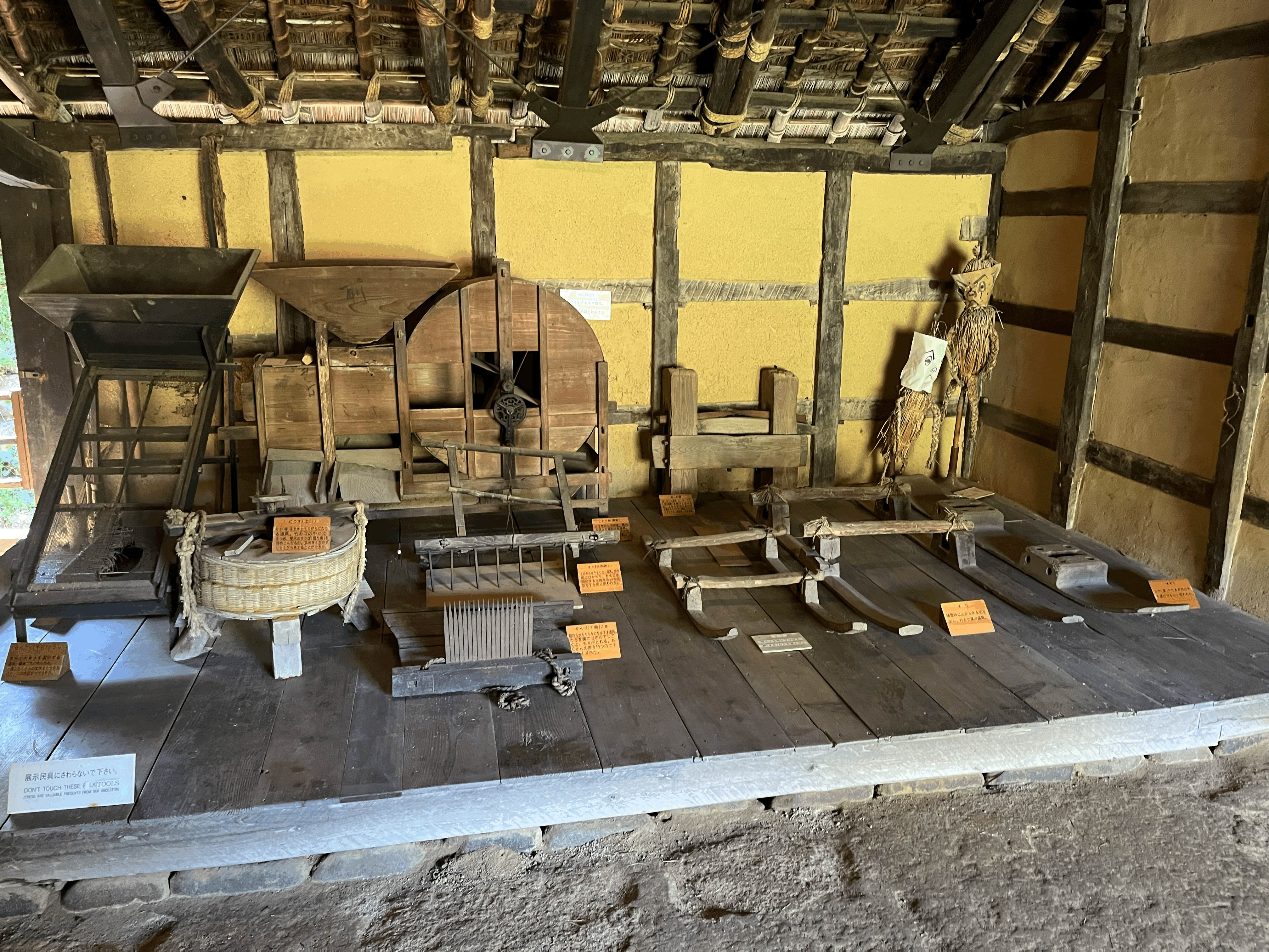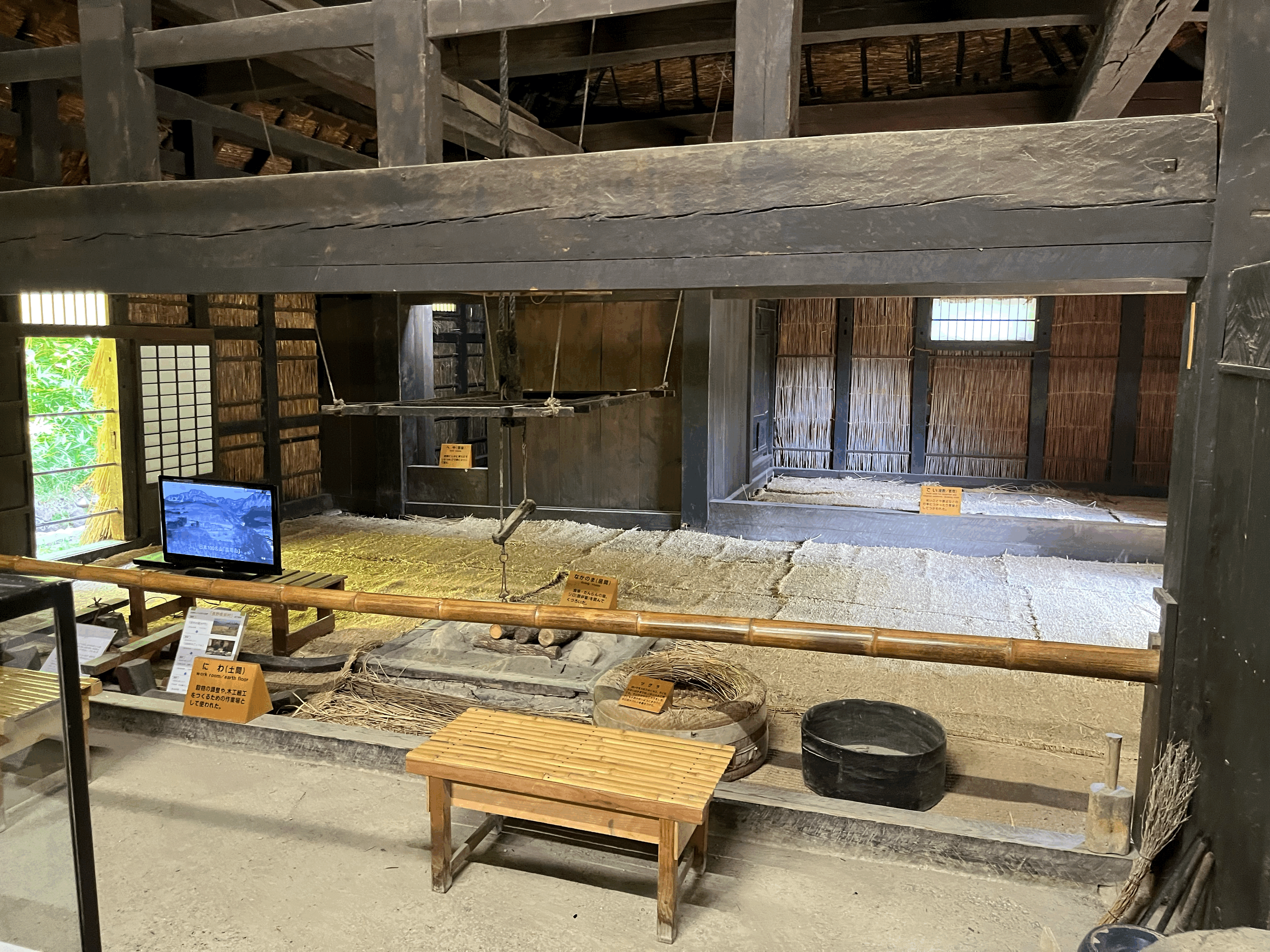 여기는 가장 왼쪽의 부엌 모습. 아궁이는 있지만 구들은 없다. 그냥 아궁이에 불을 때서 솥 같은 걸 걸고 바로 요리를 하는 구조. 천장도 무언가로 막지 않고 그냥 지붕까지 휑하게 뚫려 있다. 아마 보온보다 통기가 더 중요한 일본의 기후 특성 때문이겠지?