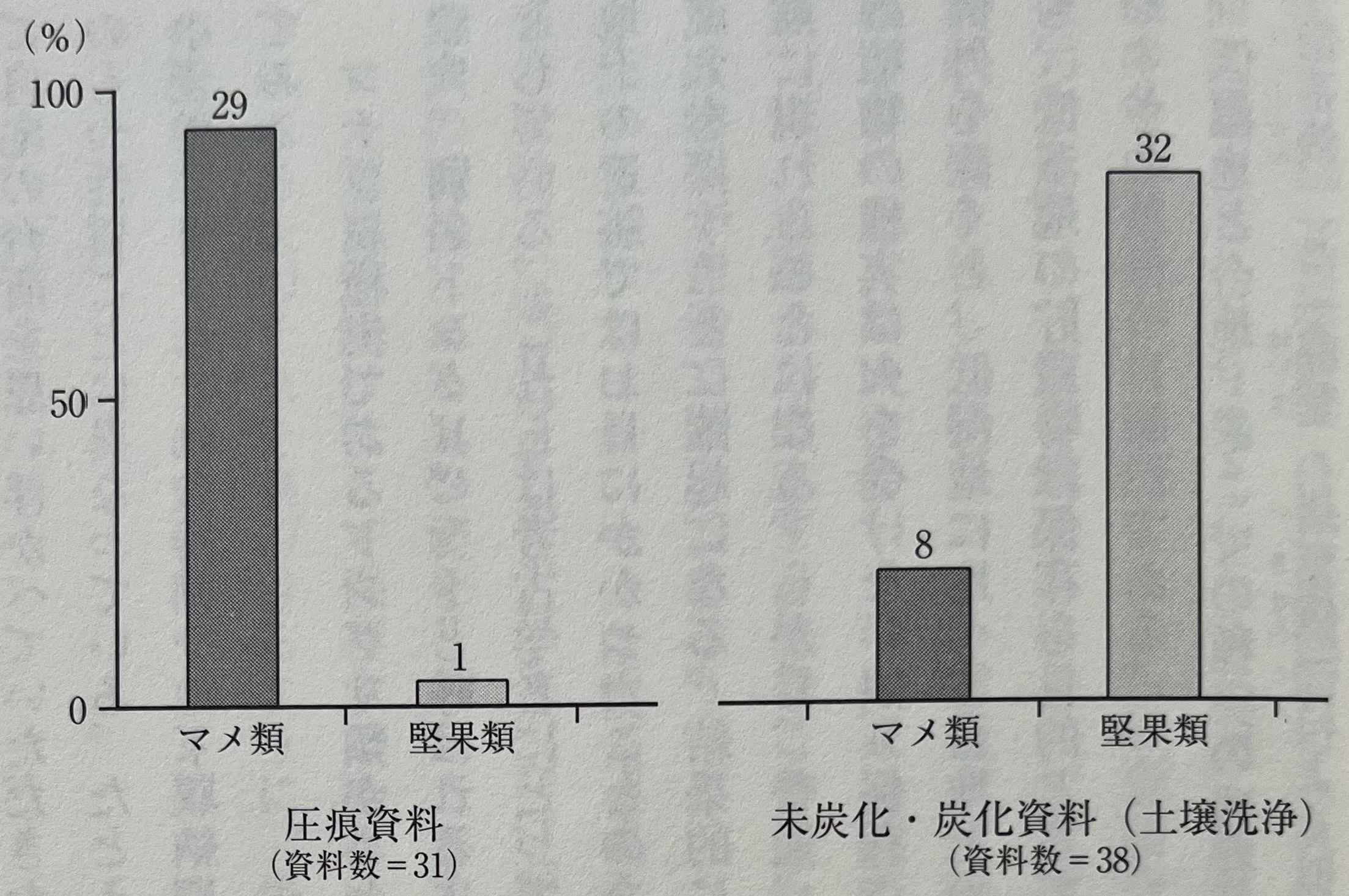 그 증거로 콩류 씨앗은 토양 안보다 토기 안에서 높은 비율로 발견된다. 취급하는 자료의 성격(분석법의 차이)에 의한 출현율의 차는 간과해서는 안 되는 사실이다. 이 사실은 오카야시에서 행한 압흔 조사에서도 증명되는데, 큐슈 지방에서는 콩이 출현하는 죠몬 시대 후기 이후의 유적 자료에 한하면 55자료 가운데 26자료(47%), 약 반분의 압흔 자료로부터 팥이나 대두의 압흔이 검출된다. 또한, 압흔 조사가 많이 실시되는 야마나시현의 사례(사노佐野 2015)를 참고해 보면, 죠몬 시대 조기부터 만기 전반까지의 압흔 조사 자료 31자료 가운데 29자료(93.5%)에서 콩류 압흔이 검출되고 있다. 이에 대해 호두나 밤, 졸참나무속 종실 같은 견과류는 겨우 1자료(3.2%)로 매우 적다. 미탄화, 탄화 자료의 경우 압흔 자료와 전혀 반대의 결과를 보여주고 있어, 38자료 가운데 견과류가 32자료(84.2%)로 높은 비율을 보여주는 데 대해, 콩류는 8자료(21.1%)에 그치고 있다(그림13). 이 야마나시현의 사례는 죠몬 시대 중기를 중심으로 한 것으로, 시기적인 특징을 반영하고 있을 가능성은 있지만 압흔으로 콩류가 남기 쉬웠단 것을 뒷받침하고 있다. 우리가 토기 압흔으로 탐사의 눈을 돌린 지 아직 일천하고, 나아가 압흔 조사 그것이 모든 지역이나 유적에서 실시되는 것은 아니라는 점에 유의해야 한다.