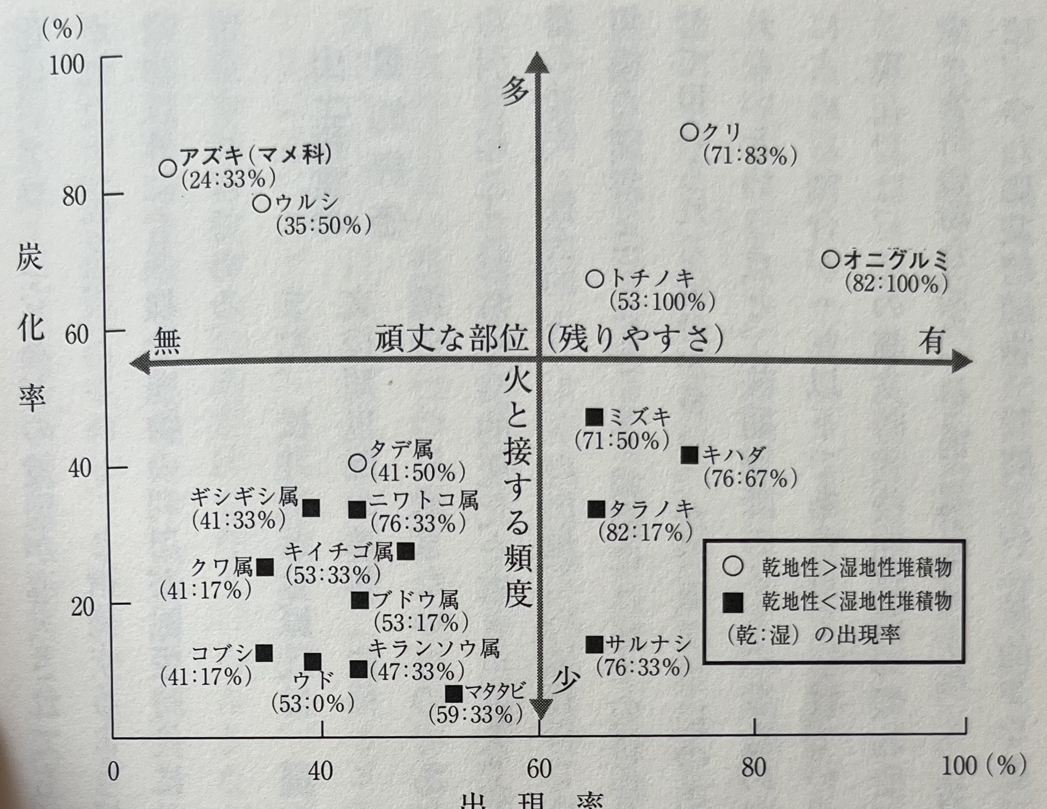 속만 먹고 단단한 껍질이 폐기되는 쪽가래나무와 종자 그것을 먹어 버리는 팥은 유적에 남아 있을 확률이 뚜렷하게 차이가 있다. 그 증거로 쪽가래나무는 모든 시료에서 검출되고 있고, 딱딱한 과피를 가진 칠엽수나 밤도 높은 확률로 출현하고 있다. 이들은 견과류라 불리는 것으로, 과피가 강건하고, 물에 잠겨도, 불에 타도 남기 쉬운 것이다. 게다가 탄화한다고 하는 건 유적에 더욱 남기 쉬워진다는 것을 의미한다. 쪽가래나무가 불에 타 있는 것은 식후에 남은 껍질을 연료로 사용했기 때문일지도 모른다.