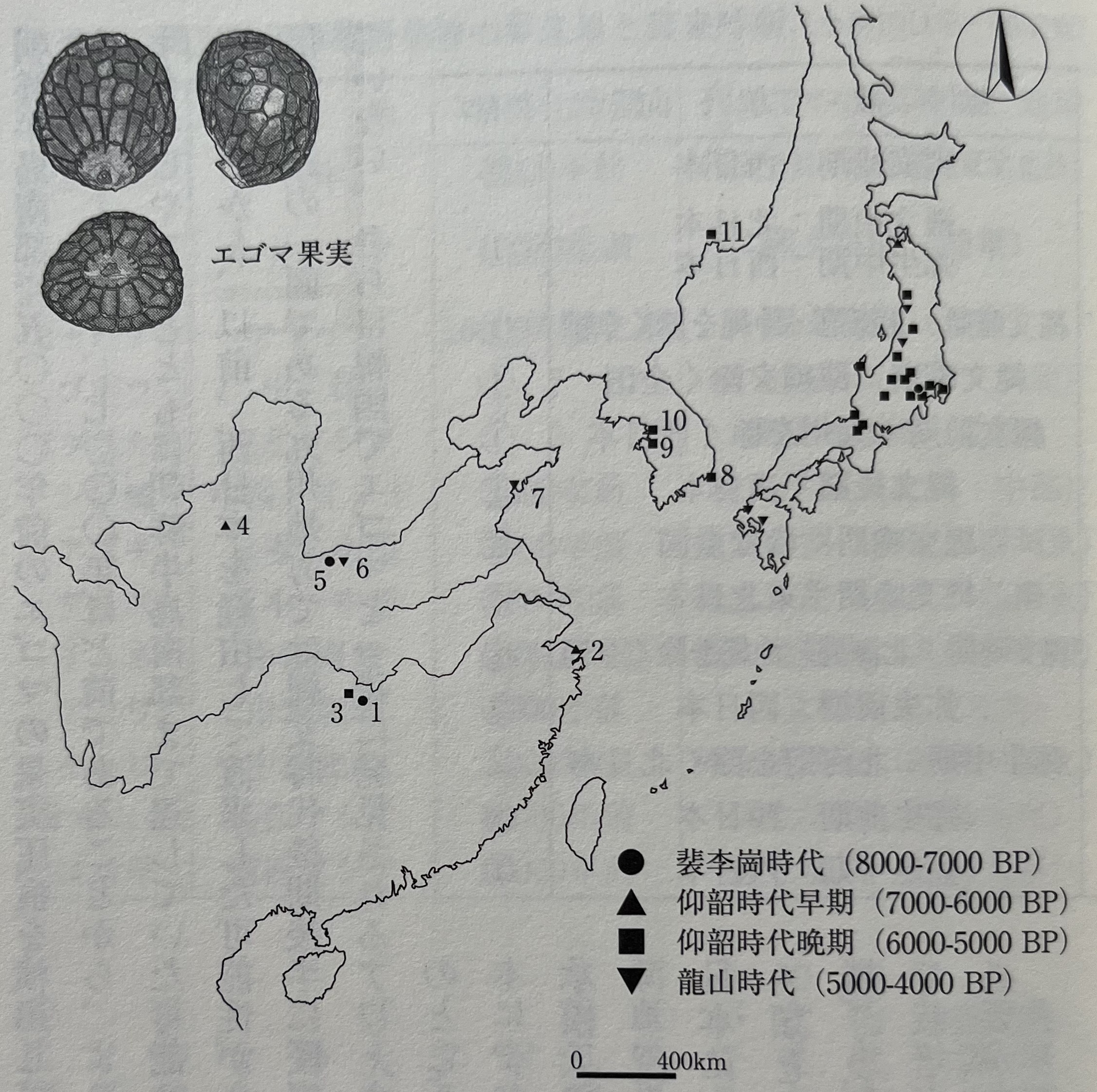 들깨에 대해서도 진짜 중국 대륙에서 죠몬 시대에 일본으로 건너왔는지 의문이다. 꿀풀과(Lamiaceae) 꿀풀속(Perilla sp.)에는 들깨(Perilla frutescens var. frutescens), 차조기(Perilla frutescens var. crispa), 새들깨(Perilla frutescens var. citriodora)가 있다. 들깨의 과실이 가장 크지만, 크기에 변이가 있기에 과실의 크기만으로 이들을 구별하는 것은 어렵다. 꿀풀속의 원산지는 중국, 인도 등이라 하며, 차조기와 들깨가 분화된 뒤 중국으로부터 일본으로 전해졌다고 한다(山口・島本編 2003). 일본에서는 죠몬 시대 조기의 예가 칸토우 서쪽 지방에 있고, 전중기도 동일본을 중심으로 하며, 후기 단계에 서일본으로도 분포가 확대된다. 중국에서 출토되는 상황을 보면, 황하 중류 지역과 장강 중류 지역 모두에 오래된 예가 있고, 형태적으로는 북쪽이 큰 들깨, 남쪽은 작은 차조기일 가능성도 있다(그림14). 우리는 조선반도 남부에서 5000년 전의 들깨 과실 압흔을 검출했는데, 중국 화북 지방에서 출토된 것은 그보다 빨라, 7000년 정도 전이기에 더 이른 6000년 전 무렵에는 들깨도 조나 기장과 함께 조선반도 남부까지 이르렀을 가능성이 있다. 일본 열도에서는 그 지리적 분포로부터 이전 서일본을 경유해 도래했을 가능성이 있다고 지적된 일이 있지만, 전파 경로의 한 획인 큐슈 지방에서는 죠몬 시대 후기 후반에 압흔이 나오기까지 그 존재는 알려져 있지 않다. 나아가 한국에서 들깨와 함께 발견되는 조, 기장이 일본으로 전파된 흔적은 지금으로서는 인정되지 않는다("벼는 언제 일본에 건너왔을까" 장을 참조). 안승모 씨에 의하면, 들깨의 야생지(기원지일 가능성)는 중국 북부, 조선반도, 일본에 있다고 한다(안 2008). 콩류와 같은 움직임을 하는 들깨(꿀풀속)도 중국 기원만이 아니라 일본에서 재배가 개시되었을 가능성도 고려할 필요가 있을 듯하다.