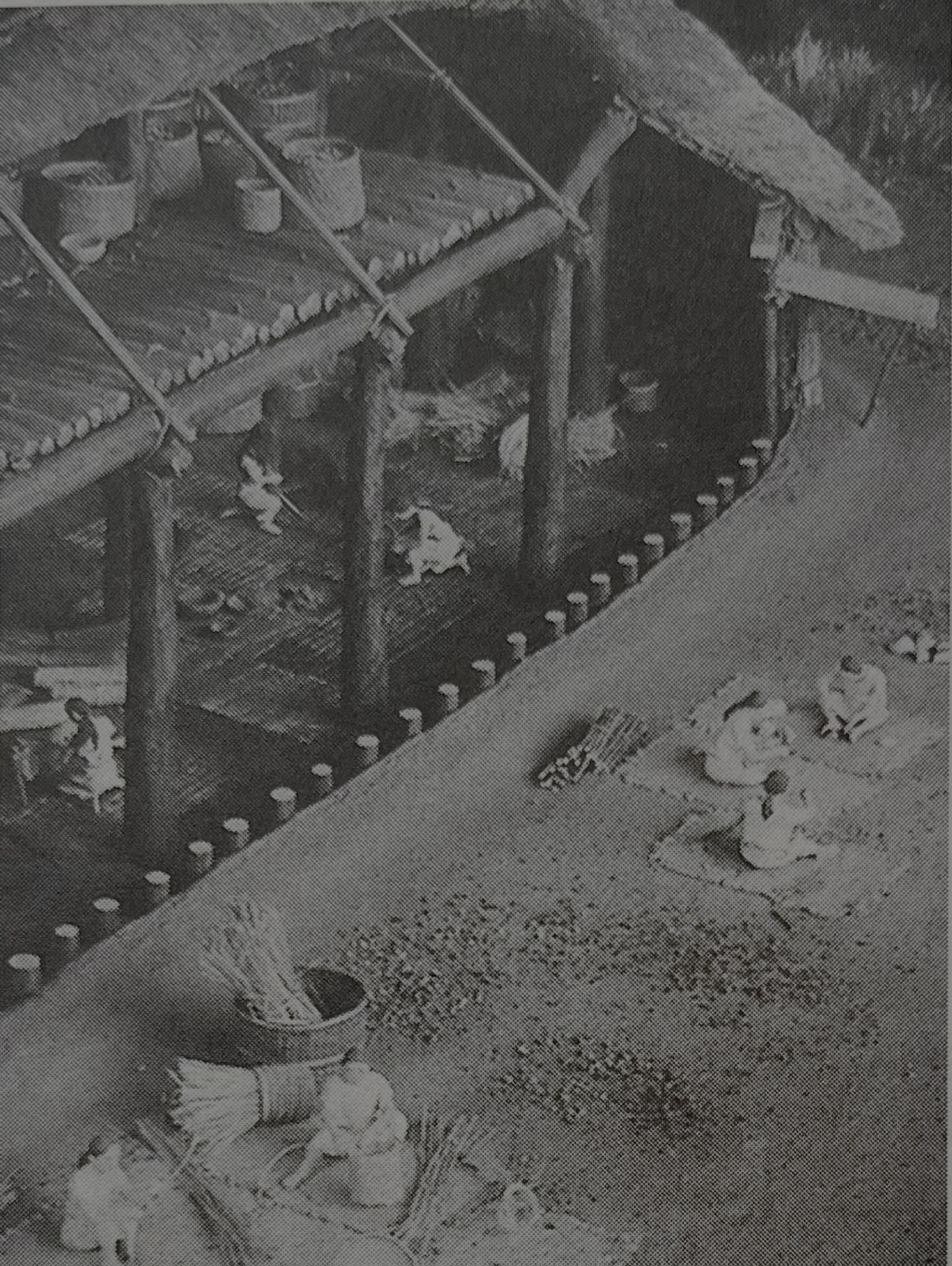 국립역사민속박물관의 제1전시실에는 이 산나이마루야마 유적의 대형 건물과 그 앞마당 모습을 복원한 디오라마가 있다. 잘 만든 디오라마로, 이 건물 전면의 광장에서는 여성이나 아이들이 토기를 만들고, 그걸 굽는 모습도 표현되어 있다(그림21). 그러나 토기 압흔으로 다수 검출된 어리쌀바구미나 실내 해충은 토기 제작 장면이 이와 같은 실외가 아니었음을 호소하고 있다. 이 벌레들의 외침에 귀를 기울여 보면, 새로운 연구의 착상점, 즉 토기 압흔은 어떻게 형성되고, 무엇을 남기기 쉬운지 하는 의문과 압흔을 토기 제작의 기술이나 장소를 복원하는 소재로 사용할 수 없을까 하는 아이디어가 떠올랐다. 결론부터 말하자면, 토기 안에 뒤섞여 들어간 곤충이나 소동물은 실내 또는 그 주변에 서식하던 것이고, 토기가 제작된 장소도 그와 같은 곤충이나 소동물이 들어가기 쉬운 환경이었을 것이라 추정된다. 그때 토기 안의 생물체는 식물도 포함되고, 인간이 이용했던 것이나 인간과 관련이 깊은 생활환을 지닌 생물군이었을 가능성이 높다고 할 수 있다. 이 후보로서 식물의 경우는 야생 유용식물이나 재배식물이, 곤충의 경우는 실내 해충이 상정된다.