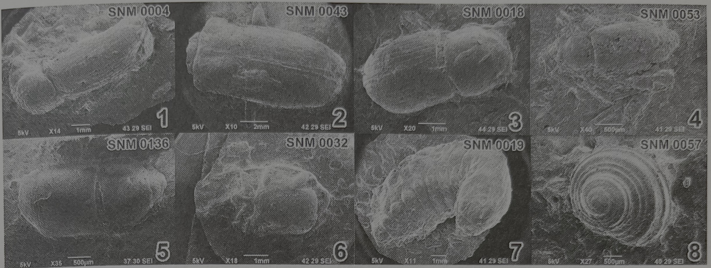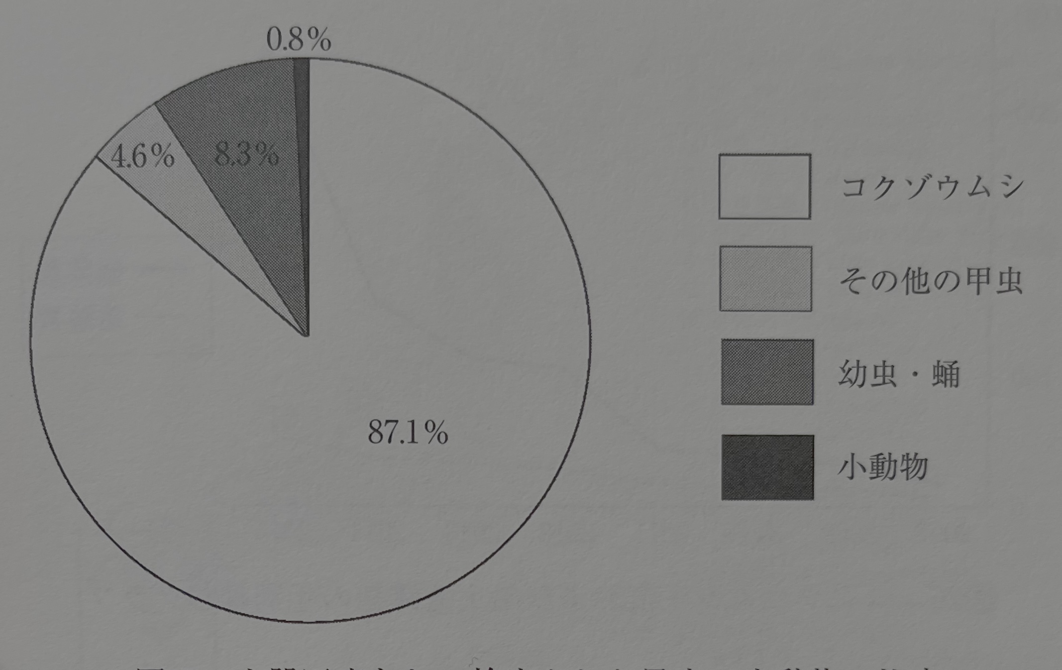 어리쌀바구미 압흔은 앞에 기술했듯이, 2015년 6월 현재 325점이고, 이때까지 발견된 그외의 곤충, 소동물의 압흔 총수는 51점이었다. 따라서 어리쌀바구미는 곤충, 소동물 압흔 수의 약 90%를 차지해 점유율로는 이상하게 많다고 할 수 있다. 사실은 압흔으로는 많이 나올 것 같은 개미의 압흔은 1점도 검출되지 않는다(그림27).