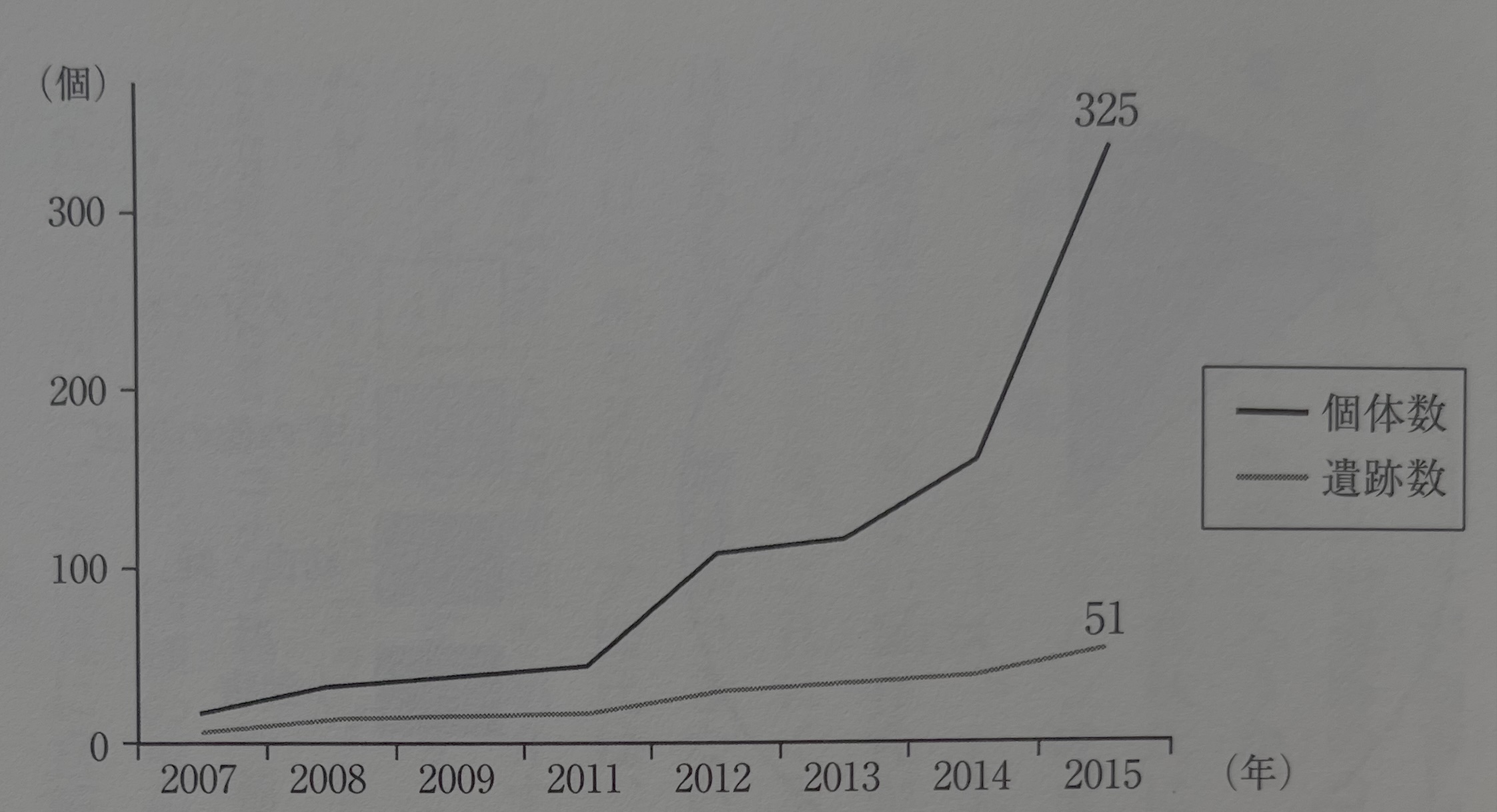 2011년의 시점에서 죠몬 시대의 어리쌀바구미 압흔은 17유적 44예였는데(小畑 2011), 그 뒤 필자 등의 조사에 의하여 1년 사이에 34유적 112예까지 증가했다(小畑 2012). 이 시점에서 북쪽은 아오모리현, 남쪽은 오키나와현까지 거의 전국적으로 분포한다는 것이 판명되었다. 다만, 오키나와현의 예는 고분 시대 상당 시기의 것이었다. 그 뒤 필자가 행한 조사에서, 호쿠리쿠北陸 지방에서도 검출할 수 있었고 아마미奄美 제도, 고토우五島 열도 등의 도서부 유적에서도 검출된다. 또한 다른 조사자에 의해서도 여러 예의 보고가 이루어진다. 이들의 성과에 의하여 서서히나마 어리쌀바구미의 분포역이나 출토되는 시기도 그 공백이 매워져 갔다. 다만, 현재로서는 큐슈 지방, 특히 남큐슈나 남서 제도의 사례 증가가 두드러진다. 이번 새롭게 집성한 바, 51유적 325점으로 증가했다(그림25). 또한 그림 26에서 보듯이, 압흔 어리쌀바구미의 검출수는 그야말로 승승장구하고 있다. 이 수치는 유적 수에서 3년 전의 3배, 2년 전의 1.5배, 압흔 수에서 3년 전의 7배, 2년 전의 약 3배로 증가한 것을 보여준다. 이 발견 개수가 극적으로 증가한 배경에는 미야자키현 모토노바루 유적에서 170점 남짓의 어리쌀바구미 압흔이 검출된 것이 크게 관련되어 있는데, 잘 보면 유적 수는 그다지 증가하지 않았고 오히려 연엑스선이나 엑스선 CT에 의한 잠재 압흔의 검출('압흔법이 밝힌 것'이란 장을 참조)이 유적 수나 개수의 일부를 증가시킨 요인이 된다. 지금으로서는 "일본 전국의 죠몬 유적 어디에서도 검출할 수 있다"고 반은 진심으로 허충을 떨고 있을 정도이다.