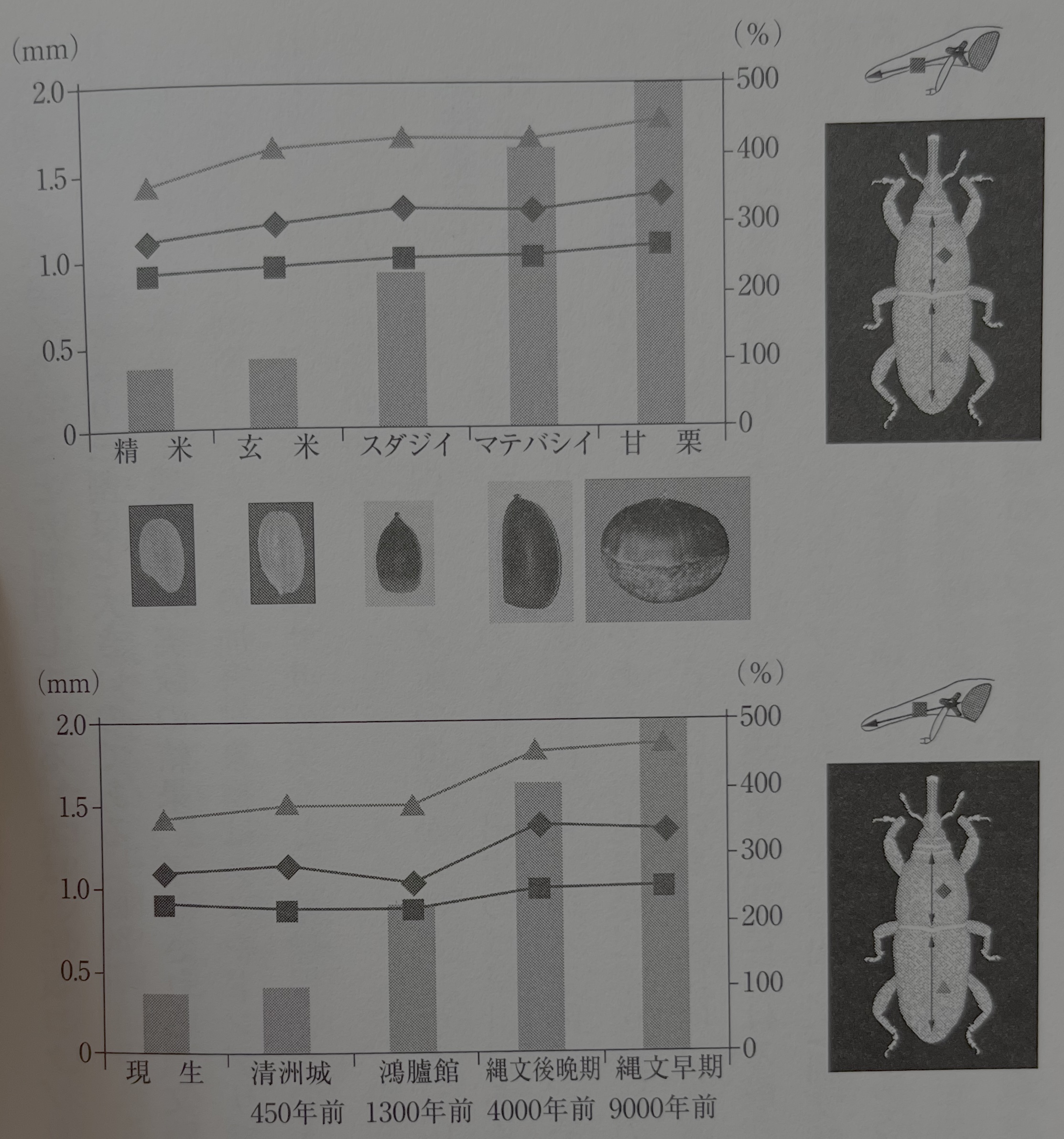 고고 유적은 화석 자료와 현생 어리쌀바구미 사이를 매우고 해충으로서 진화하는 과정을 해명할 열쇠를 쥐고 있다. 적어도 말할 수 있는 건, 일본 열도에서는 1만 년 전 이후 인간이 도토리나 밤을 채집해 그것들을 축적하게 되어 어리쌀바구미가 기생, 해충화했다. 현재의 어리쌀바구미는 지금으로부터 3000년 전 무렵 벼의 유입을 계기로 벼에 특화해 소형화한 것일까, 아니면 이미 벼에 기생하던 작은 어리쌀바구미가 전래되어 재래 도토리 어리쌀바구미와 융합한 것일까? 이 수수께끼를 푸는 열쇠는 역시 어리쌀바구미의 크기에 있다.
