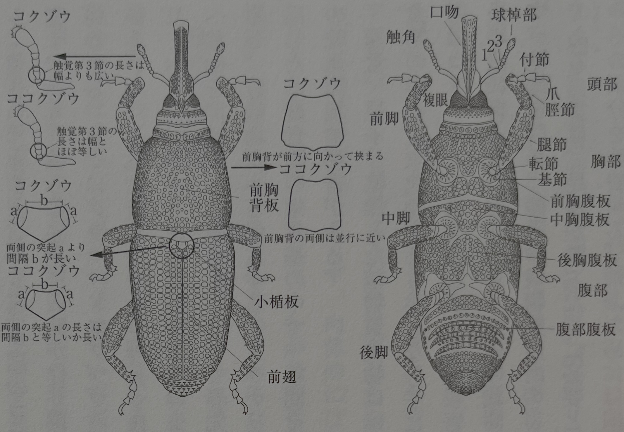 이를 보여주기 좋은 예로서 콩류를 가해하는 콩바구미과(Bruchidae)의 곤충이 있다(그림15). 해충 콩바구미류에는 그 생활형에 '야외형'과 '실내형' 2종이 있다. '야외형'이란 성충이 밭의 아직 익지 않은 콩의 꼬투리에 산란해 그 안에서 부화한 유충이 콩알의 안에 들어가, 그것을 먹으면서 콩의 성숙과 함께 자라는 것으로 일본에서 확인되는 해충 콩바구미류 가운데 누에콩바구미(Bruchus rufimanus BOHEMAN)과 완두콩바구미(Bruchus pisorum L.)가 이에 속한다. 이들에 반해 '실내형'은 팥바구미(Callosobruchus chinensis L.)와 네점콩바구미(Callosobruchus maculatus)가 그 좋은 예로, 유충운 완숙한 콩만으로 생활을 반복할 수 있다(梅谷 1987). 마찬가지로, 어리쌀바구미(Sitophilus zeamais MOTSCHULSKY)가 속하는 어리쌀바구미속 갑충의 자매종인 적갈색쌀바구미(Sitophilus granarius L.)와 일본의 벼바구미(Sitophilus oryzae L. 그림16)은 '실내형'으로, 그들은 완전히 인간이 만들어낸 인공적인 곡물 저장 시스템에 적응한 것이라 한다. 특히 적갈색쌀바구미는 오늘날까지 자연의 저장장에서는 발견되지 않는다고 한다. 이에 반해 어리쌀바구미는 실내형이지만 밀밭의 현장 가해도 기록되어 있어 야외형과 실내형의 절충형 생활형을 갖는다. 어리쌀바구미는 8월 무렵부터 월동 장소로 이동을 개시해 휴면한다. 그리고 이른봄에 꽃의 꿀을 빨고, 6월 무렵 창고에 밀 등이 운반되어 들어오면 저곡 장소에 침입한다. 적갈색쌀바구미나 벼바구미는 인간이 만들어낸 저장 음식의 영양 기초 안에서 1년 동안을 보내며, 기본적으로 날아다닐 수 없다. 그것은 저장장의 건조 환경에 비밀이 있다.
