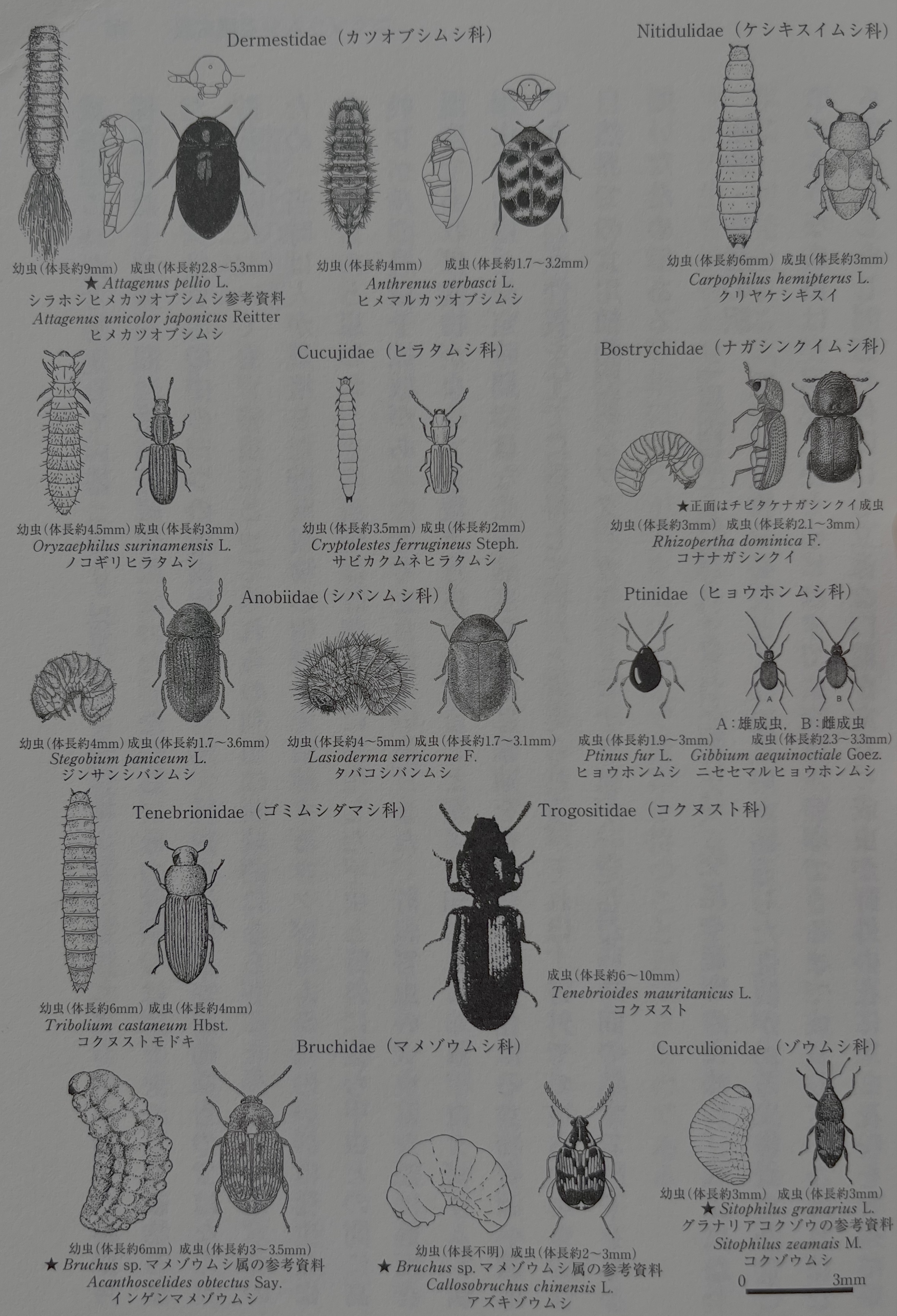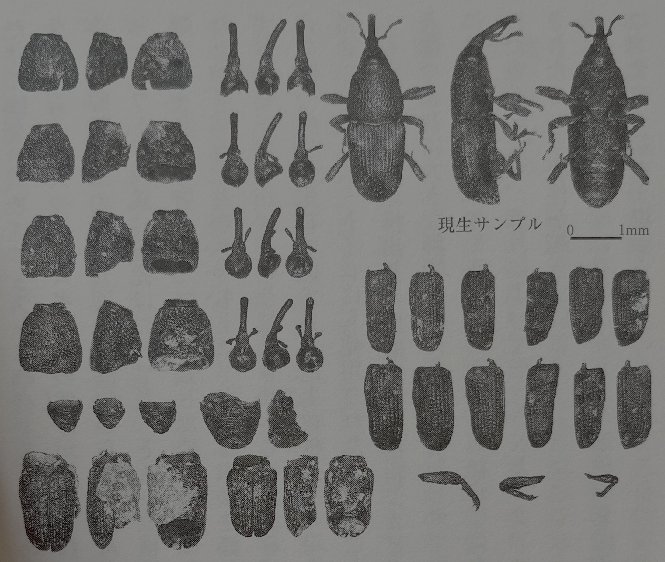 다만, 여기에서 볼 수 있는 곤충상은 자연환경을 축으로 하여, 인간이 관여한 환경(공간)도 '도시'나 '마을 산' 등 큰 생활환경의 구별에 머물러 '화장실'이나 '쓰레기장' 등의 일부를 제외하고 더욱 작은 주거환경을 보여주고 있지는 않다. 또한 해충으로 취급되는 것은 바구미를 제외하고 벼나 밭작물의 해충으로, 말하자면 야외형 곤충군뿐이다. 마찬가지로 곤충과 사람의 관계를 개략적으로 기술한 시야케 시게히코初宿成彦 씨 등의 저서에서도 화장실이나 쓰레기장 이외는 곤충 유체가 나타나는 주변 환경 이상으로는 좁혀지지 않는다(大阪市立自然史博物館 1996). 이러한 가운데 미야타케 요리오宮武頼夫 씨는 의식적으로 '실내 해충'이라는 분류군을 만들어 헤이죠우쿄平城京 터의 나가야오우長屋王 저택, 후지와라노 마로藤原麻呂 저택 출토의 쿠키 모양 탄화물 안에 들어간 바구미를 소개하고, 가루에 묻은 채 굳어졌을 가능성을 지적한다(宮武 1999). 게다가 헤이죠우쿄에서 발견된 머리대장가는납작벌레(Oryzaephilus surinamensis L.)나 거저리(Neatus picipes) 등의 저곡 해충도 소개한다.