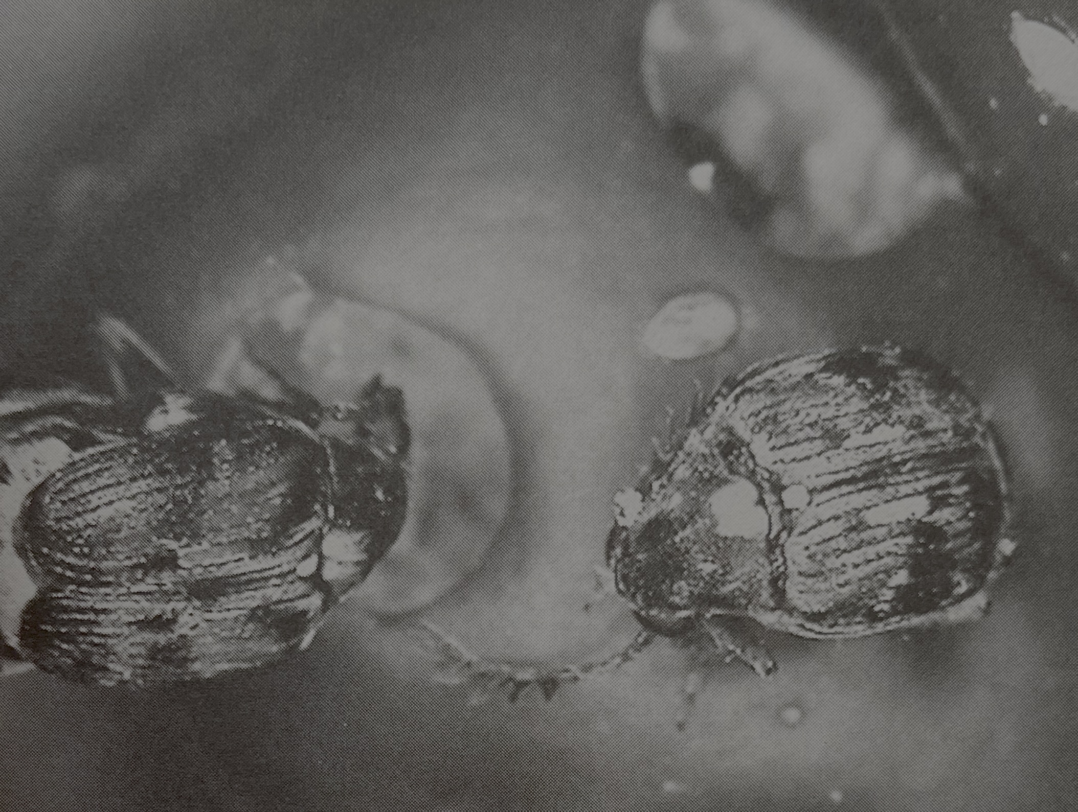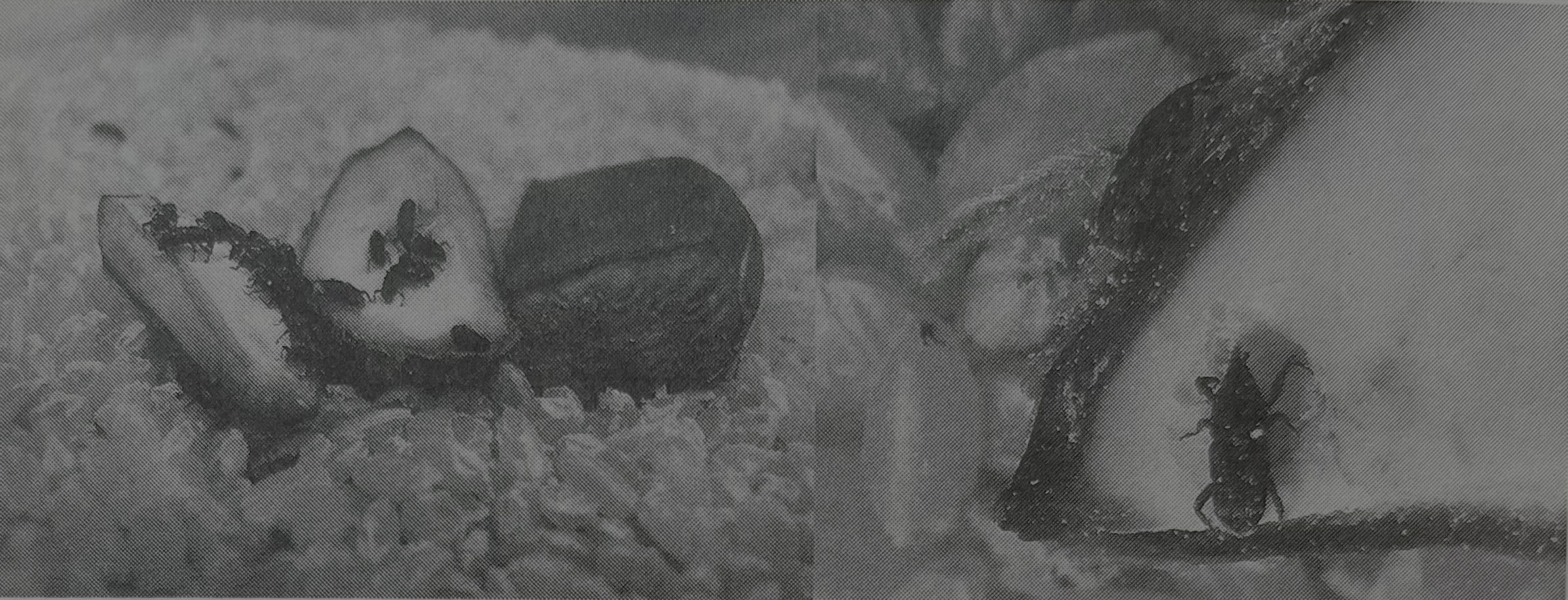 들로벨과 그르니에 둘은 어리쌀바구미와 적갈색쌀바구미를 졸참나무속과 밤의 종자에서 키우는 실험 예를 소개하며 도토리 안에서 발견된 어리쌀바구미속 갑충의 예를 든다(Delobel and Grenier 1993). 주버트 씨는 남아프리카 너도밤나무의 깨진 도토리 안에서 바구미를 발견하고(Joubert 1966), 밀스 씨는 캔자스의 인도산 참나무(Quercus incana, 졸참나무속의 일종, 일본식 이름 없음)의 깨진 종자 안에서 어리쌀바구미를 발견한다(Mils 1989). 똑같은 사례는 근처에서도 일어났다. 도토리 연구의 제1인자 이와나가 테츠오岩永哲夫 씨는 2012년 4월에 미야자키현 사이토시西都市의 미나미카타南方 신사에서 채집한 모밀잣밤나무, 가시나무, 종가시나무의 안에서 어리쌀바구미 몇 마리를 발견했다. 필자는 그 가운데 한 마리를 나누어 받아서 쌀로 사육하던 중에 실수로 으깨 버렸다. 낙담하고 있던 차에 그녀가 알을 낳았던 듯하고, 그 6월 쌀 안에서 36마리의 차세대가 탄생했다는 전말이 있다(그림28).