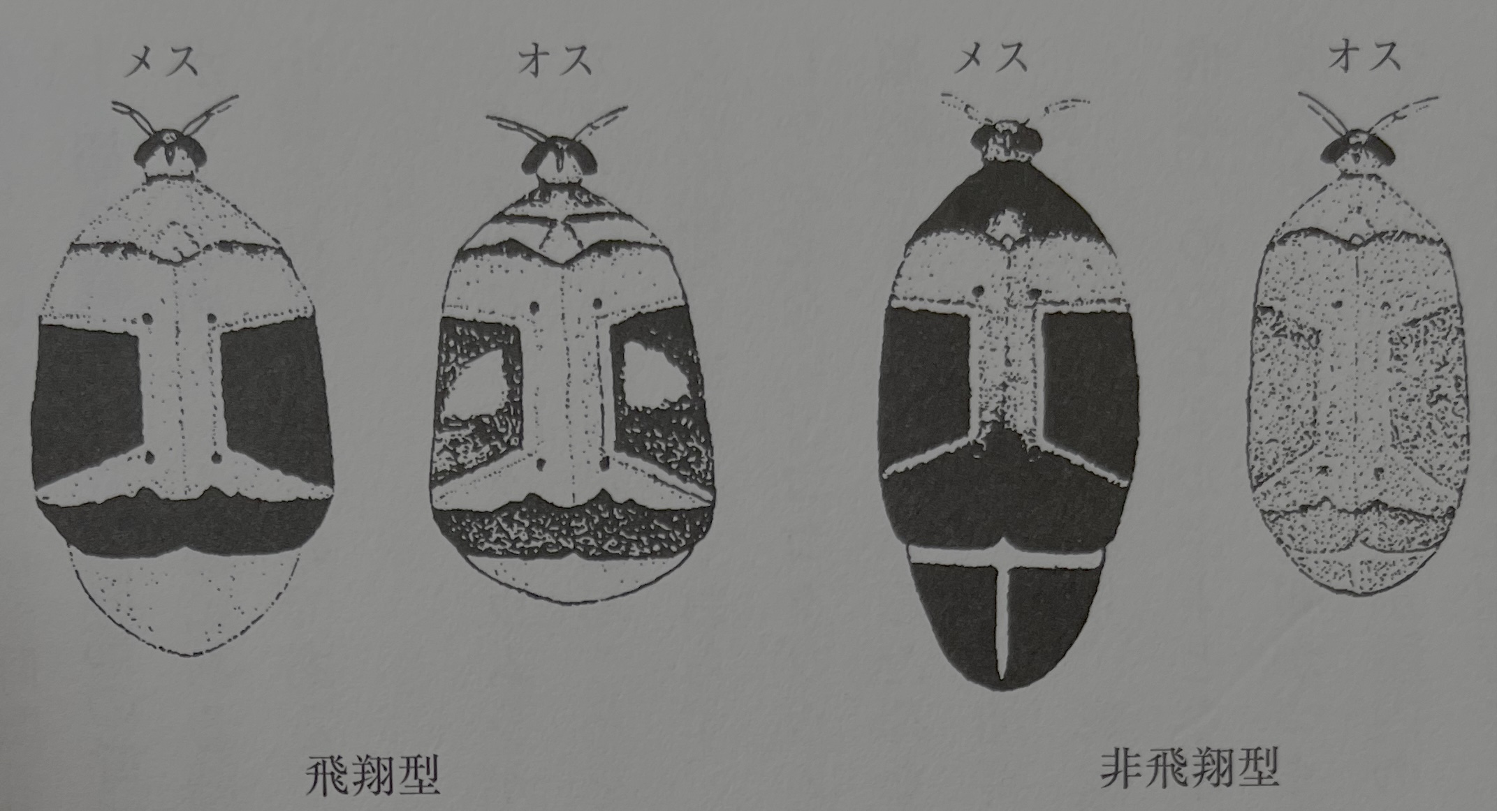 콩을 가해하는 네점콩바구미의 성충에게도 비상형과 비비상형이 있고, 형태적으로도 다른점을 볼 수 있다고 한다(그림17). 비상형은 날개가 길고, 날기 위한 에너지가 되는 지방량도 많은 데 반해 비비상형은 지방이 적은 대신에 배 안에는 성숙한 알이 가득 차 있어 우화 직후에도 곧바로 교미·산란을 행할 수 있다. 즉 비비상형 쪽이 실내의 콩 저장이라는 환경에서는 증식에 적합하다 할 수 있다.