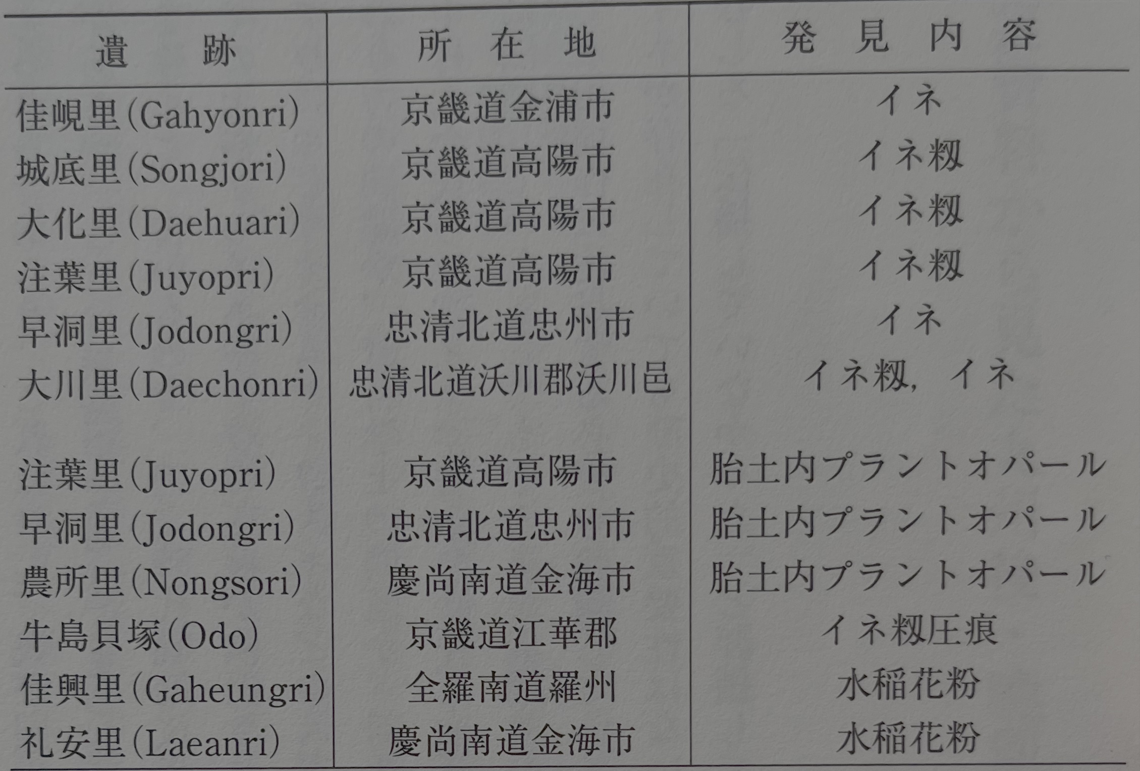 조선반도 남부에서 조, 기장을 주로 하고 대두나 팥, 들깨 등을 재배한 농경에서 벼가 들어온 것이 빗살무늬 후기 이후이다. 다만, 빗살무늬 후기로 거슬러 올라가는 벼 자료는 논의의 와중에 있다(표6). 청동기 시대, 즉 민무늬 토기 전기 단계의 벼 자료는 의심의 여지가 없지만, 신석기 시대의 벼는 사람에 따라 평가가 다르다. 현재, 빗살무늬토기의 바탕흙 안에서 벼의 플랜트 오팔(식물의 세포 안에 축적된 종 고유의 형태를 한 유리질)이 검출되었다고 보고되는 것은 만기의 예로 농소리 유적, 후기의 예로 조동리 유적이나 주엽리 유적 등이다. 이 플랜트 오팔에 의한 재배종의 존재 가부 검토 문제점에 대해서는 코우모토 마사유키甲元眞之 씨가 후대 자료의 혼입 가능성 문제와 함께, 동정의 어려움을 지적한다. 안승모 씨도 벼의 특징으로 여겨지는 부채꼴의 플랜트 오팔이 벼 이외의 다른 식물에도 유사한 것이 존재할 가능성을 지적한다. 쇼다 신야庄田慎矢 씨는 조선반도의 신석기 시대 벼 자료는 자료를 음미하면 토기 안의 플랜트 오팔 자료밖에 남지 않았고, 오염의 가능성도 버릴 수 없다며 그 평가는 어느 쪽이라고 말할 수 없다고 결론을 지었다. 한국에서 행한 압흔 조사에 의해서도 아직 신석기 시대의 벼는 확인되지 않았다고 한다(中村 외 2011).