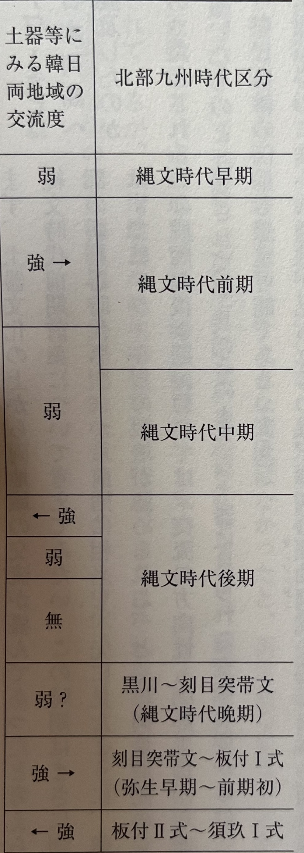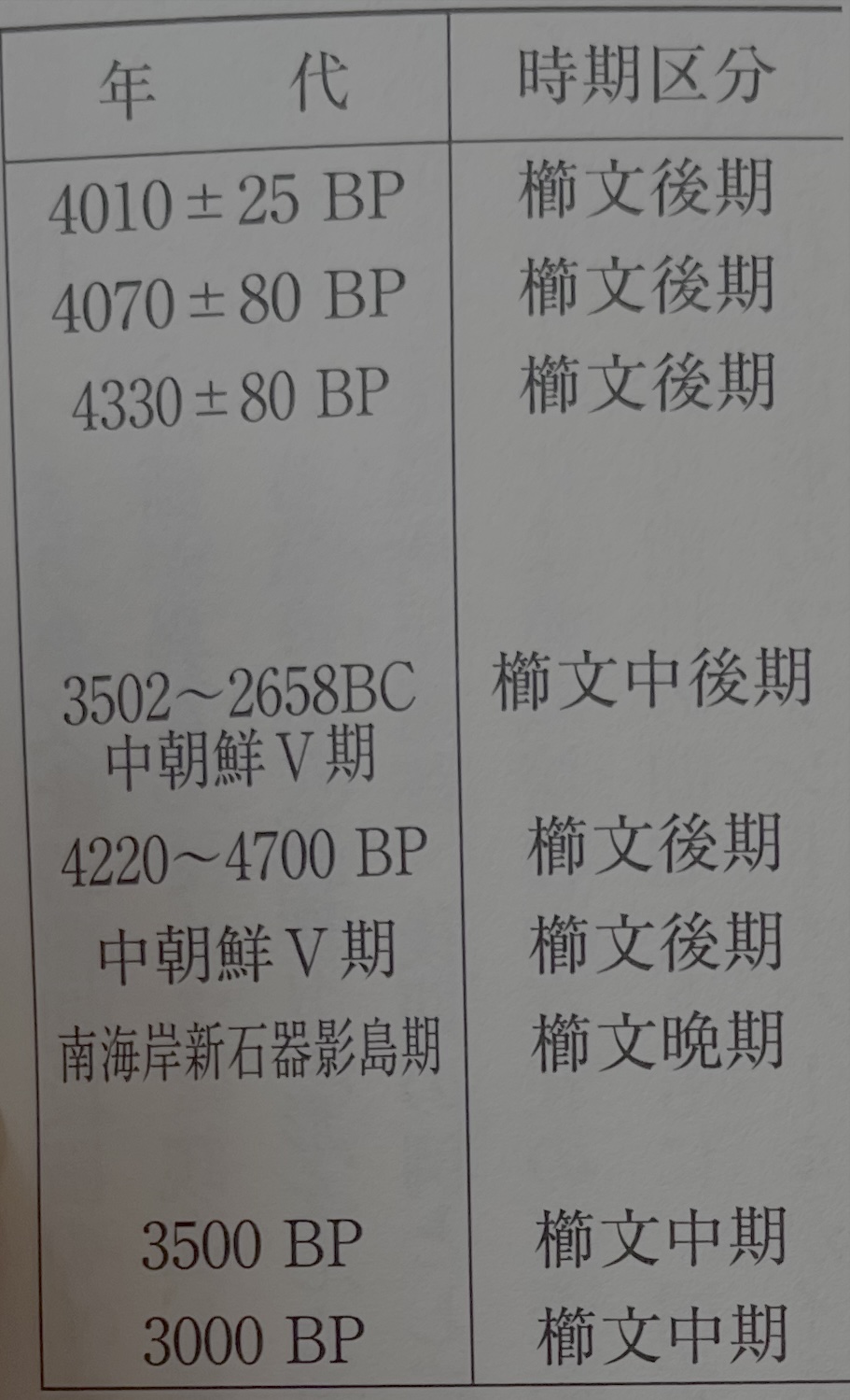 우선, 토기 문화에서 두 지역의 교류가 성행했다고 생각되는 죠몬 시대 전기 전엽에 대하여 생각해 보고 싶다. 이 시기는 바로 조선반도 남부의 신석기 시대 조기 말부터 전기에 상당하고, 앞에서 보았듯이 한국 남부에서는 이미 조, 기장의 재배가 인지된다. 특히 두 지역 사이의 교류가 성행했다고 여겨지는 이 단계의 후반기에는 교류의 방향성도 조선반도부터 북부 큐슈를 향한 것으로 평가되며, 이와 같은 토기에서 볼 수 있는 교류의 모습으로부터는 충분히 조, 기장 농경의 전파도 상정할 수 있다(표5).