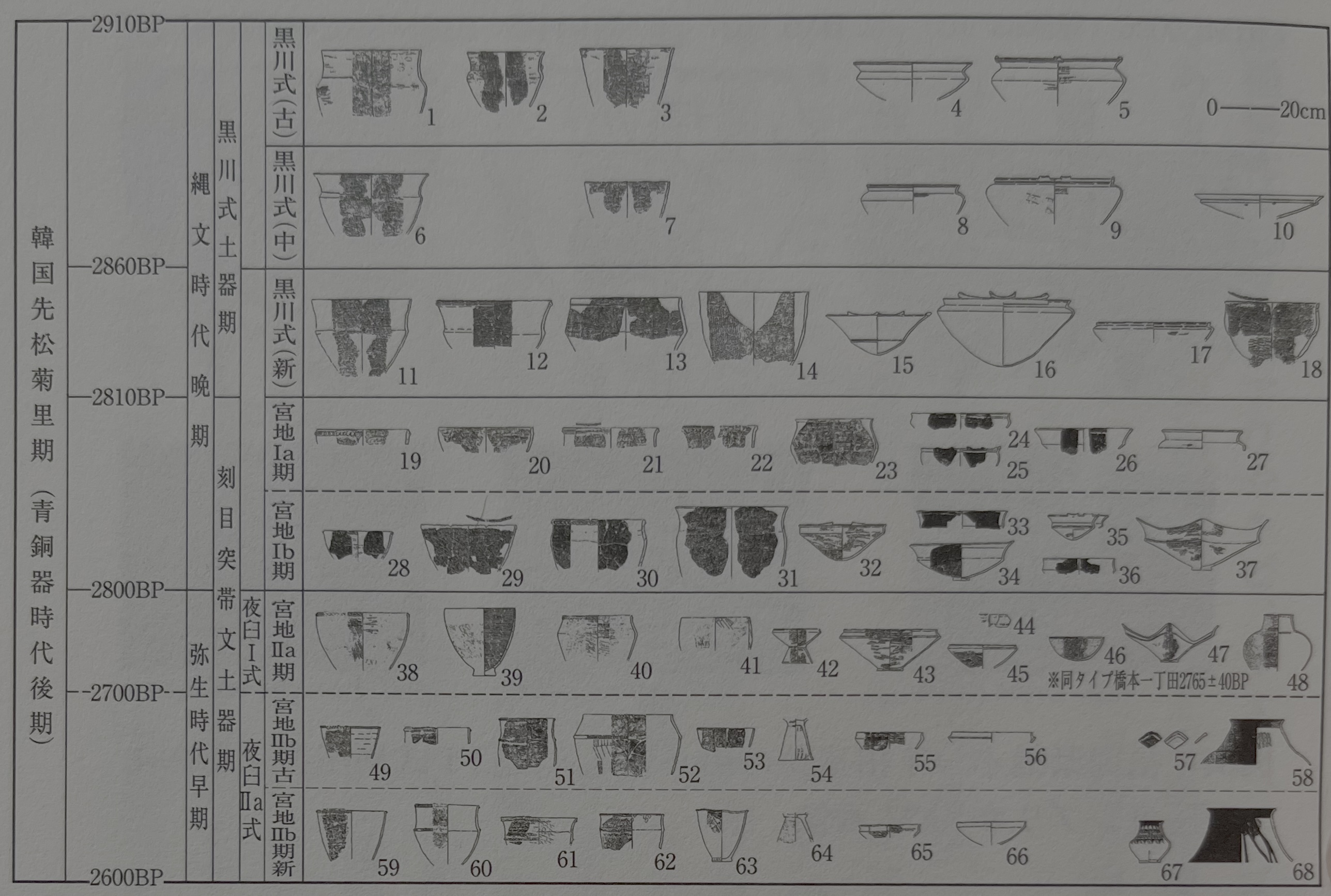남겨진 문제는 쿠로카와식 토기와 덧띠무늬토기 사이에 자리매김할 수 있는 히고바루 단계(東 2009)의 편년적 자리매김이나 쿠로카와식 새 단계의 지역별 연대차이다. 히고바루 단계의 토기는 가고시마현이나 미야자키현, 나가사키현 남부를 포함한 지역에 분포하는 지역적인 토기인데, 쿠로카와식 토기 새 단계부터 미야치 편년의 덧띠무늬 I기를 포함하고, 경우에 따라서는 덧띠무늬 II기의 일부를 포함할 가능성이 있다. 예를 들면, 가고시마현 카미즈루上水流 유적의 히고바루 단계로 여겨지는 지느러미 달린(鰭付) 얕은 바리 모양 토기는 2710 ±30 BP의 연대치를 가지고, 이것은 북부 큐슈의 야마노테라식, 유우스 I식 토기보다도 50년 새롭다. 또한, 히고바루 단계가 쿠로카와식 토기 새 단계와 같았더라도 지역별로 동일한 토기 형식의 사용 연대나 사용 기간에 기울기가 있다면, 토기에서 나오는 압흔 곡물을 토기 형식별로 늘어놓아도 곡물의 확산 상황은 복원할 수 없다. 국립역사민속박물관의 연대 측정 결과에 의하면, 새김덧띠무늬토기의 지역적 연대적 기울기는 북부 큐슈와 남부 큐슈에서는 200년 정도의 차이가 있다고 한다. 큐슈 죠몬 문화연구회의 토론회 자리에서 미야모토 카즈오 씨는 북부 큐슈에서는 덧띠무늬토기가 사용되고 있을 때, 중남부 큐슈에서는 아직 쿠로카와식 토기를 사용하고 있었다는 생각을 제시했다.