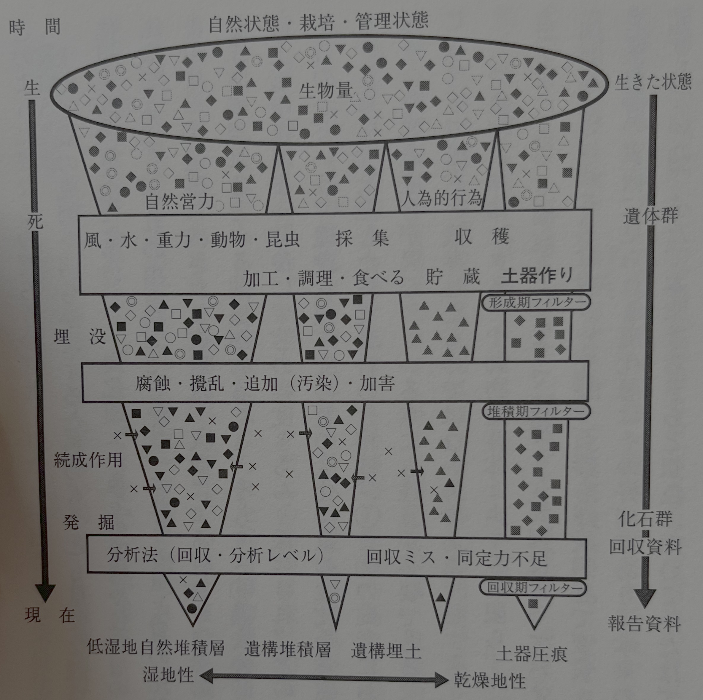 대형 식물 유존체(씨앗)이나 동물 유존체(뼈)에 한정하지 않고, 유물이 형성되어 매몰되고 고고학자에 의해 회수되기까지 다양한 요인에 따라 바이어스(편차, 변질)이 생긴다(그림38). 사실 남아 있는 상태가 좋은 토기나 석기도 매몰 과정에서 변질, 변형되어 있는 것이다. 예를 들면, 석기의 표면에서 볼 수 있는 풍화층은 그 좋은 예로, 본래의 석기는 흰 풍화충이 없고 검게 빛나고 있었다. 또한 본래 반짝반짝 은빛으로 빛났을 철기에 보이는 갈색의 녹도 매몰 과정에서 변질, 변형된 결과이다. 그러나 유적에 남겨진 씨앗이나 뼈 등의 유기물은 이들 무기질 인공 유물보다 변질, 변형 작용을 받기 쉽고, 이 때문에 다양한 바이어스가 선사 시대의 식사를 복원하는 데 큰 장벽이 되며, 최종적으로 보고되는 자료군의 질과 양을 한정한다(Deborah 2000). 그들 바이어스는 과거부터 현재까지 다양한 자료 개변의 요인 필터가 존재하고, 자료가 그것들을 거쳐 현재에 이르고 있기 때문에 생기는 것이다. 그와 함께 그 바이어스가 걸리는 방법은 자료의 회수, 분석법에 따라서도 달라진다. 즉 과거에 일어났던 사건은 이 시간 경과(세로축)와 분석 수법(가로축)이 고안해내는 필터망을 여과해 온 유물군(바이어스 집합체)로서 표현되는 것이다. 고고학자는 남겨진 유물에 대하여 그와 같은 바이어스가 걸려 있음을 충분히 이해하고 유물군을 해석해야 한다.