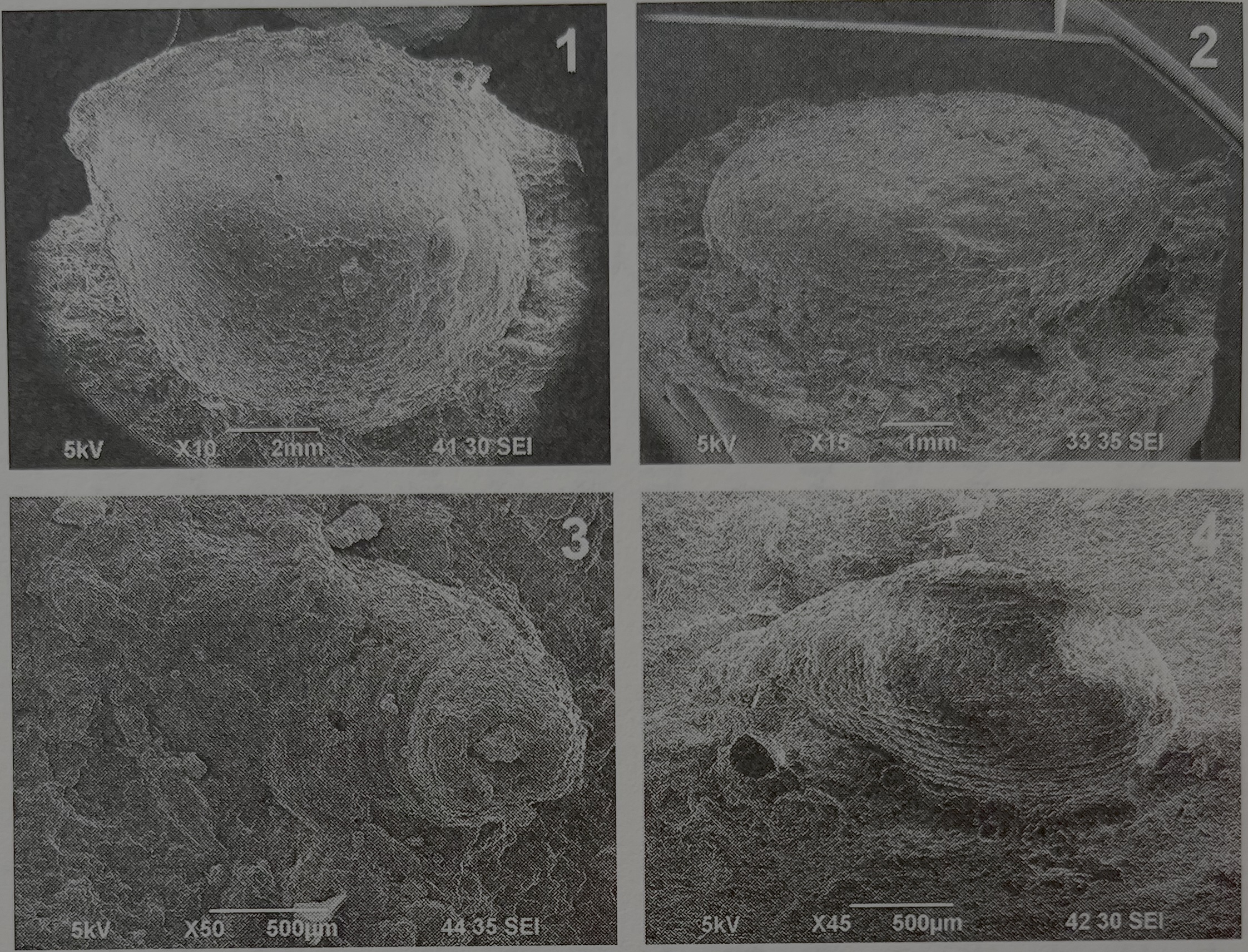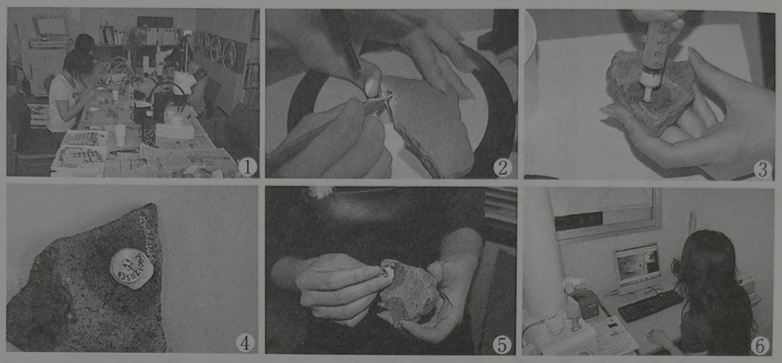 복제법에서는 육안이나 저배율 루뻬를 사용해 토기 표면이나 단면에 남은 식물의 꽃가루나 벌레, 조개 등의 압흔을 찾아내고, 그곳에 인상재를 충전해 볼록한 상을 만든다. 그리고 그 동정이나 관찰, 촬영에는 할 수 있는 한 주사형 전자현미경을 사용하는 것이 추천되는 것도 유럽과 공통이다(그림37). 다만, 조사자에 따라 다른 것은 인상재를 충전하기 전에 토기 압흔 표면에 바르는 이형제나 본뜨기 위한 인상재 그것이다. 이형제는 토기나 압흔의 표면이 인상제에 의해 파손되는 것을 막거나, 복제품을 토기에서 떼기 쉽게 하는 효과가 있다. 마기드 씨 등은 이형제로 바세린과 파라핀의 톨루엔 용액을 소개한다(Margid and Krzywinski 1995).