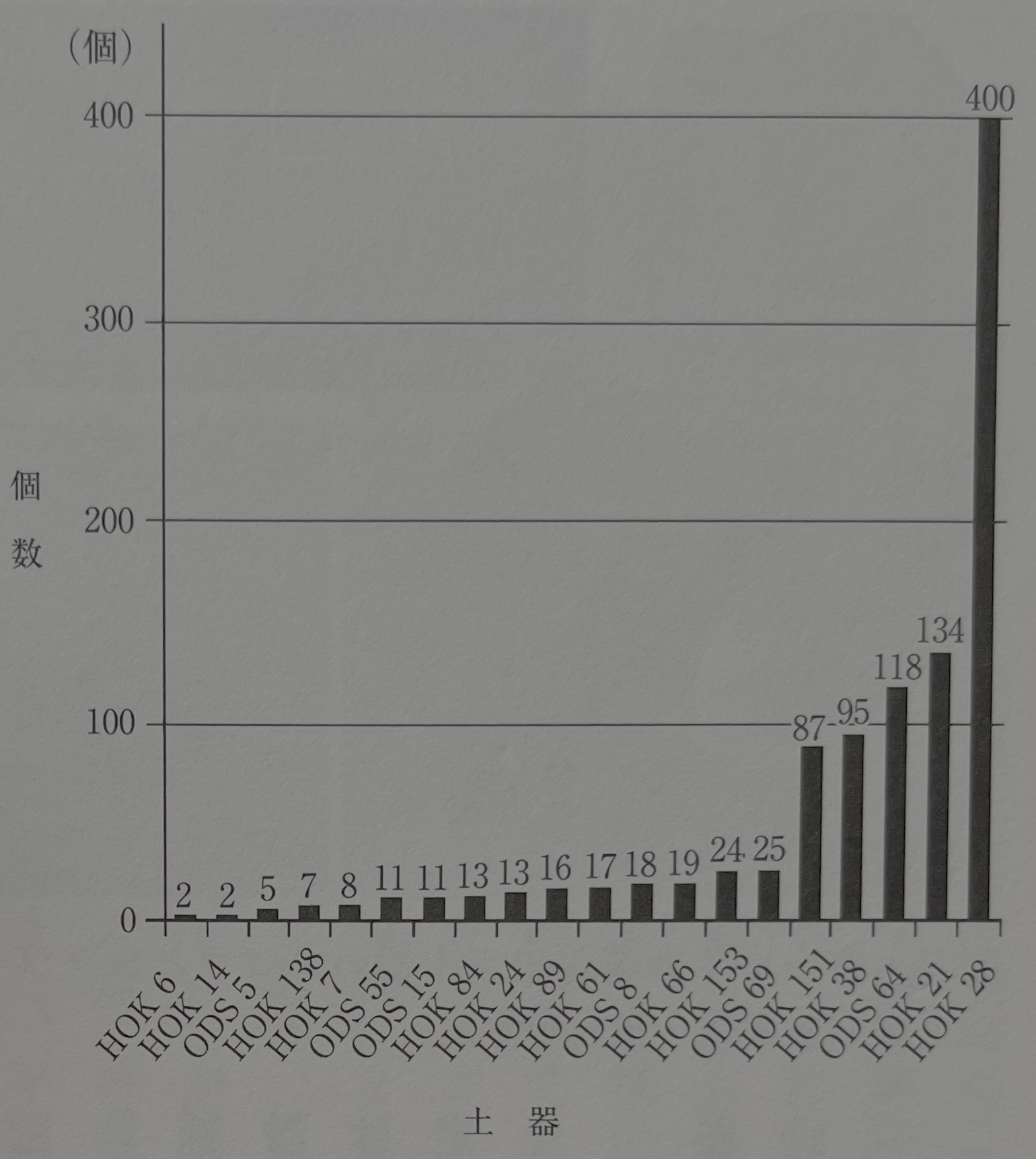 게다가 오다케 패총의 들깨가 들어간 깊은 바리 토기는 토기 1개체로 복원했을 경우, 약 1700점의 들깨가 들어가게 된다. 이 들깨의 수는 두 손으로 가볍게 한 움큼의 분량으로, 이와 같은 현상은 들깨를 점토 안에 섞는다는 강한 의지가 없으면 일어날 수 없다. 이 경우, 단위면적(100평방 센티미터)으로 환산하면 118점이 되어 들깨나 조 등의 소형 종실의 경우 의도적 혼입의 기준치 80점을 크게 넘는다. 이 80점이란 기준치는 히라오카 유적과 오다케 패총의 들깨가 2배 이상 들어간 토기 조각에서 구한 단위면적당 갯수의 편중에서 도출한 것으로, 25점 이하인 집단과 87점 이상인 집단의 사이에 동떨어진 복원 수의 차가 있었단 것을 근거로 한다(그림46). 또한 80점 이상인 토기 집단의 바탕흙 안에는 들깨 과실이 대부분이고 과피도 인지되는 데 대해, 25점 이하인 집단의 경우 과피가 거의 없는 반면, 가지나 기타 종의 종실이 들어가는 등 혼입물의 질도 둘 사이에 다른점이 이를 뒷받침했다. 똑같은 종실 혼입 예는 시대와 지역마다 다르지만, 오키나와현 나고시名護市의 미조바루溝原 패총 출토 조를 혼입한 구스쿠グスク 토기에서도 검증할 수 있었다. 이 경우는 단위면적당 복원 갯수는 103점이었다.