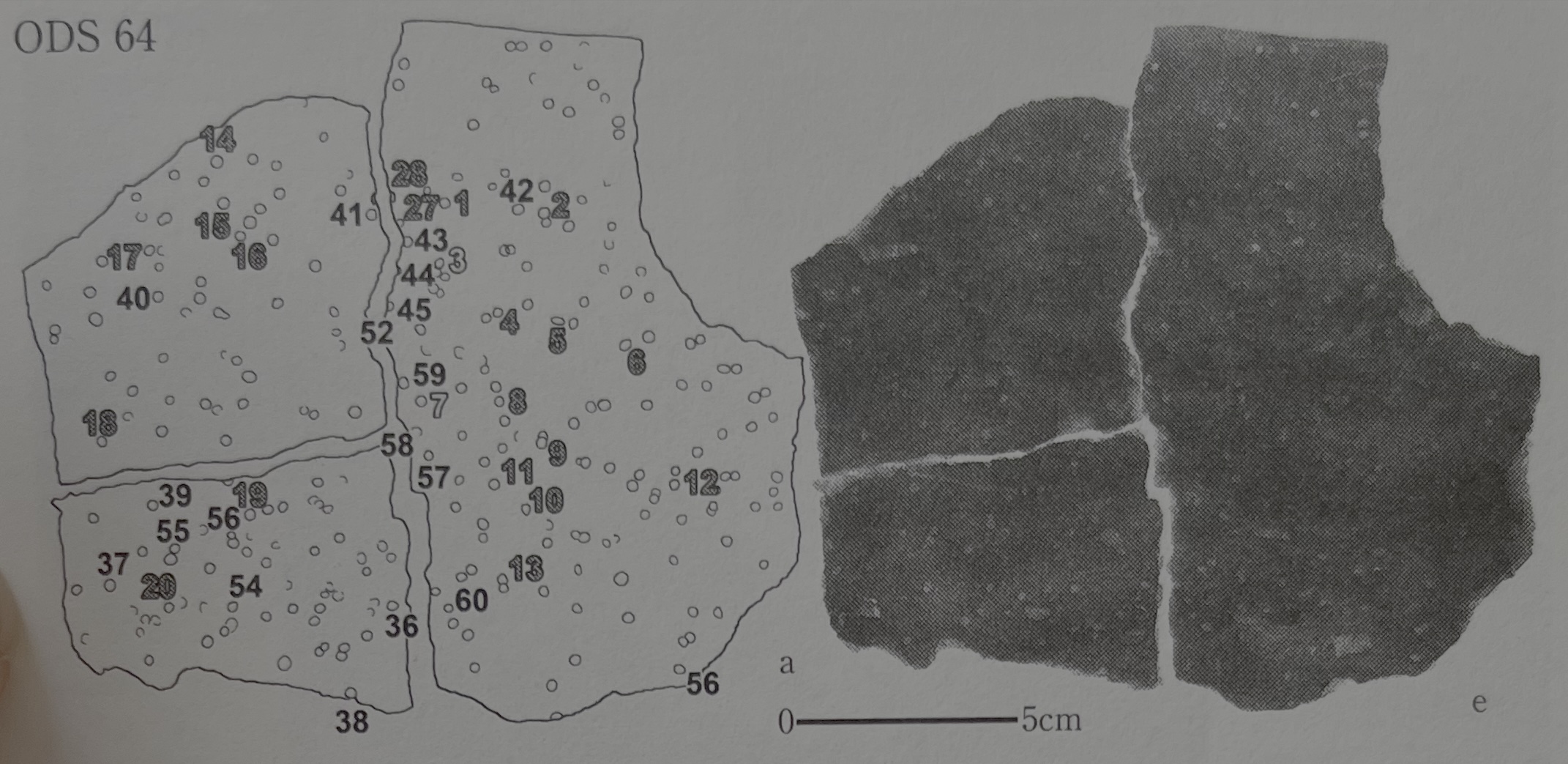 2014년 봄부터 이 연X선 장치를 도입해 잠재 압흔의 검출 작업을 시작했다. 대상 자료는 도야마시에 있는 오다케小竹 패총과 같은 곳의 히라오카平岡 유적에서 출토된 죠몬 시대 전기 후엽의 토기이다. 오다케 패총 출토 토기의 경우, 초기의 조사에서 들깨 과실이 다수 포함된 깊은 바리 모양 토기의 대형 파편(ODS 64)이 검출되었기에, 우선은 그것을 연X선으로 들여다 보았다. 이 토기는 다른 조사자에 의한 초기 조사에서 들깨가 33점이라 보고되었는데, 필자 등의 육안에 의한 재조사에서 66점(2배)으로 증가했다. 이것도 숙련도의 차이인가 하고 약간은 궁금했는데, 연X선에 의한 조사를 행한 바 526점(재조사의 약 8배)이나 되는 압흔이 나왔다(그림44). 또한 히라오카 유적에서는 표출 압흔 168 : 잠재 압흔 68점(약 5:2)이라 하는 육안에 의한 조사로부터 40% 증가하는 높은 수치를 얻을 수 있어, 압흔 연구의 정량 분석에서는 잠재 압흔의 조사가 빠질 수 없다는 것을 충분히 실감했다. 또한 정성 분석에서도 히라오카 유적의 표출 압흔에서는 들깨 과실(과피), 덧나무 핵, 층층나무 핵, 졸참나무속 과피, 마디풀과 과실, 대두속 씨앗, 팥 유형 씨앗, 강아지풀 겉껍질 있는 과실 등 8종에 대하여, 잠재 압흔의 종류는 들깨 과실(과피), 덧나무 핵, 어리쌀바구미 3종이었다. 종류는 적었지만 연X선에 의한 잠재 압흔 조사를 하지 않으면 어리쌀바구미는 검출할 수 없었다(그림45). 이 사실은 정성적 분석 연구에서도 잠재 압흔의 탐사를 행할 필요성을 강하게 시사한다.
