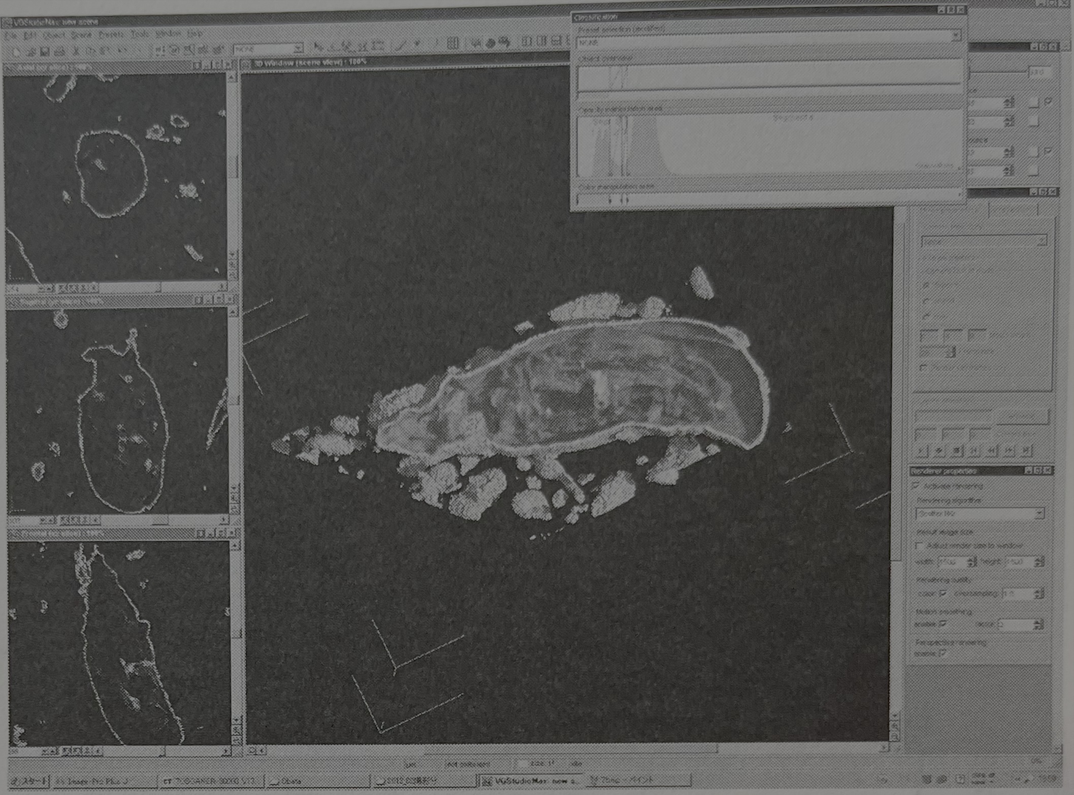 사실 지금까지도 X선이나 X선 CT를 써서 잠재 압흔을 추출하고 3D 화상으로 만드는 일은 행하고 있었다. 나카야마 세이지中山誠二 씨는 이들 기기를 이용해 야마나시현 사케노미바酒呑場 유적의 대두 압흔이 검출된 이도지리식井戸尻式 토기의 손잡이 부분에서 또 1점의 대두 같은 압흔을 검출한다(中山 2010). 필자 등도 X선 CT에 의하여 가고시마현 오구라마에 유적의 덧띠무늬 시기 항아리 모양 토기의 주둥이 부분에서 어리쌀바구미 잠재 압흔의 검출(그림43)에 성공했다(真邉・小畑 2011). 그러나 X선 CT 스캐너에 의한 잠재 압흔의 검출은 매우 비용(시간과 경비)이 들어 수천 점에서 만 점 규모의 다수 토기를 조사하는 압흔 조사에는 적합하지 않으며, 실용적이지 않다는 것을 실감했다. 또한, 압흔 탐사의 첫 단계에서 유물 촬영용 X선을 사용하는 것도 현실적이지 않다고 생각했다.
