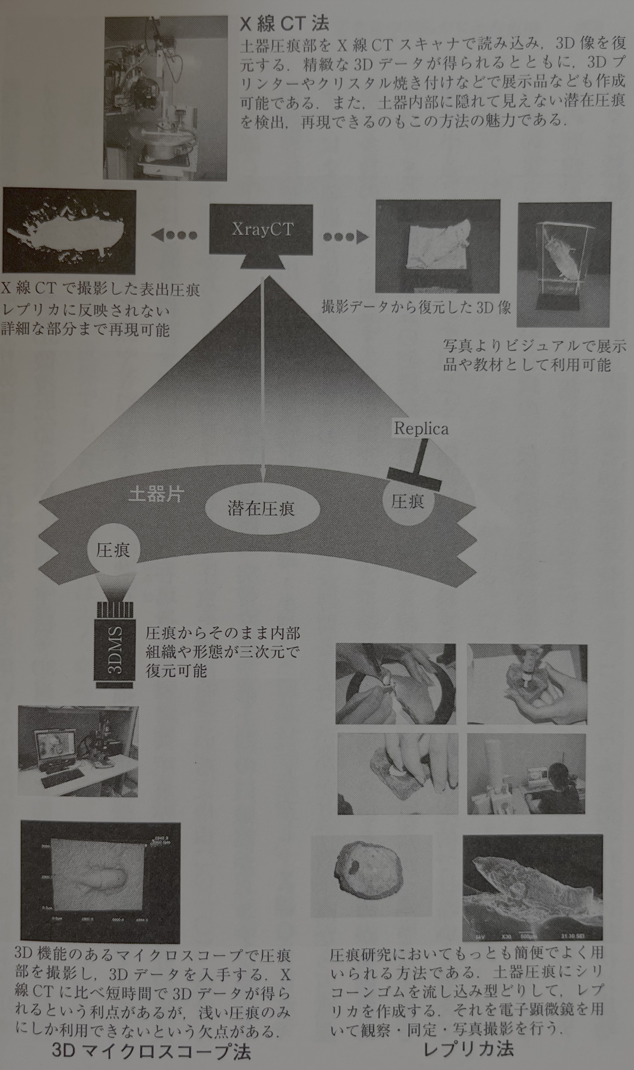 현대 의학계로 보급된 것이 말해주듯이, X선 기기나 X선 CT 기기가 외면으로는 보이지 않는 체내의 질환부를 검출하기 때문에 큰 효력을 발휘한다. 고고학의 세계에서도 이들의 기기는 옛날부터 사용되어, 최근에는 특히 X선 CT 기술이 발달해 이들을 이용한 연구나 조사가 다수 실시되고 있다. 이들 기기가 잠재 압흔의 검출에 유효한 것은 누구나 생각할 수 있을 것이다. 필자는 종래의 주요 압흔 조사법인 복제법에 이들 X선 CT를 이용한 압흔 조사와 똑같은 기기 및 3D마이크로스코프에 의한 3D상 복원 수법(X선 CT법, 3D MS법)을 더해 압흔법으로 재정의했다(그림42).