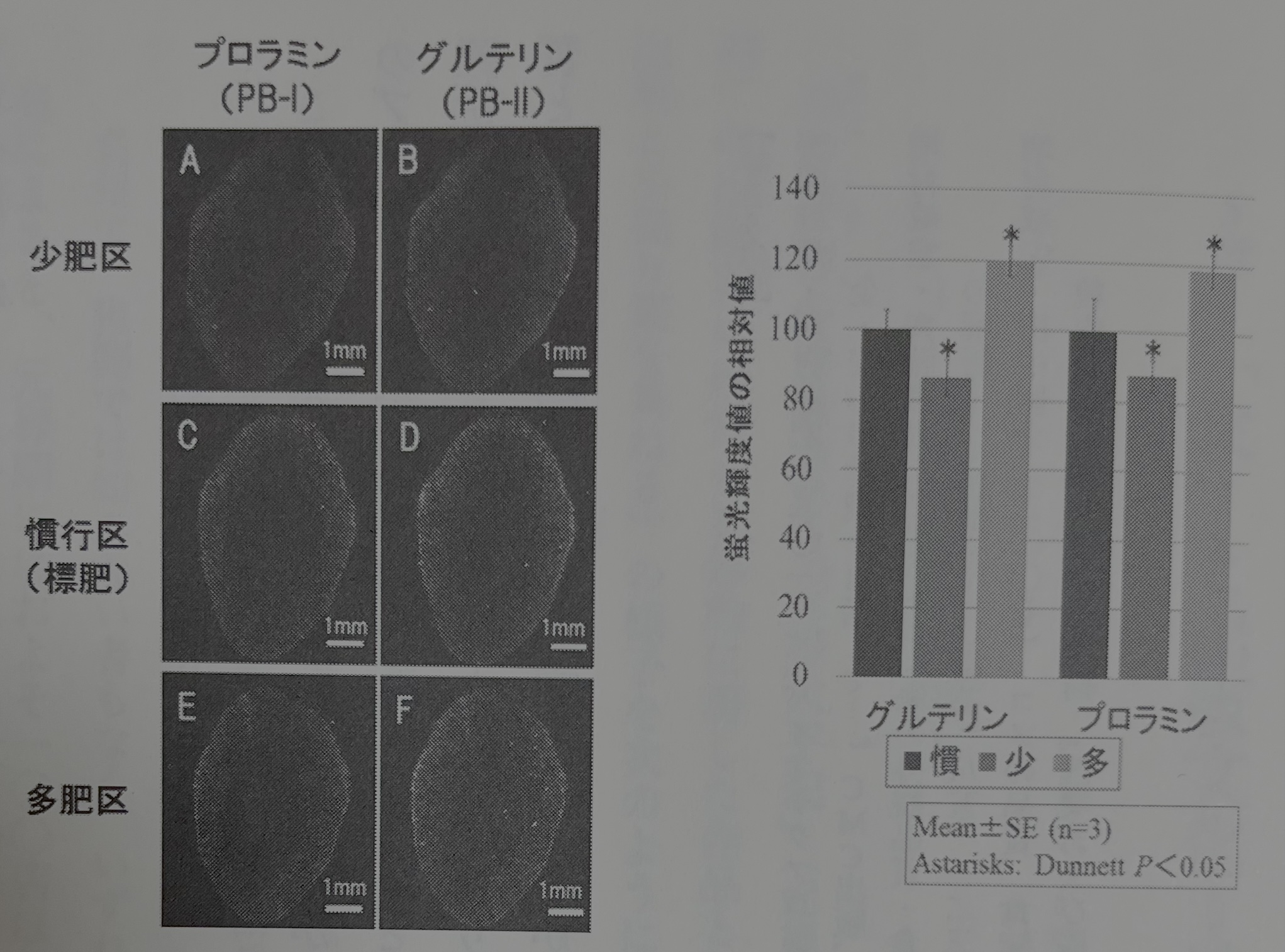 단백질이 많이 함유된 쌀은 밥을 지을 때 흡수성이 떨어지고, 밥을 지은 뒤에는 밥이 딱딱해져 끈기가 저하되는 경향이 있었다. 그러나 밥맛에 강한 영향을 주는 것이 프롤라민인지 글루테린인지는 알 수 없었다. 소량 비료·표준 비료로 재배한 '코시히카리'에서는, 프롤라민의 형광 신호가 약했지만(A, C) 다량 비료로 재배하면 쌀알 주변부에서 증대되었다(E). 글루테린도 마찬가지로 다비로 재배하면 형광 신호가 증대되었다(F). 화상 해석 소프트웨어를 이용해 형광 신호를 수치화하면 쌀알 바깥 둘레 부분에서 프롤라민의 분포 편중이 글루테린보다도 크다는 것을 알 수 있었다.