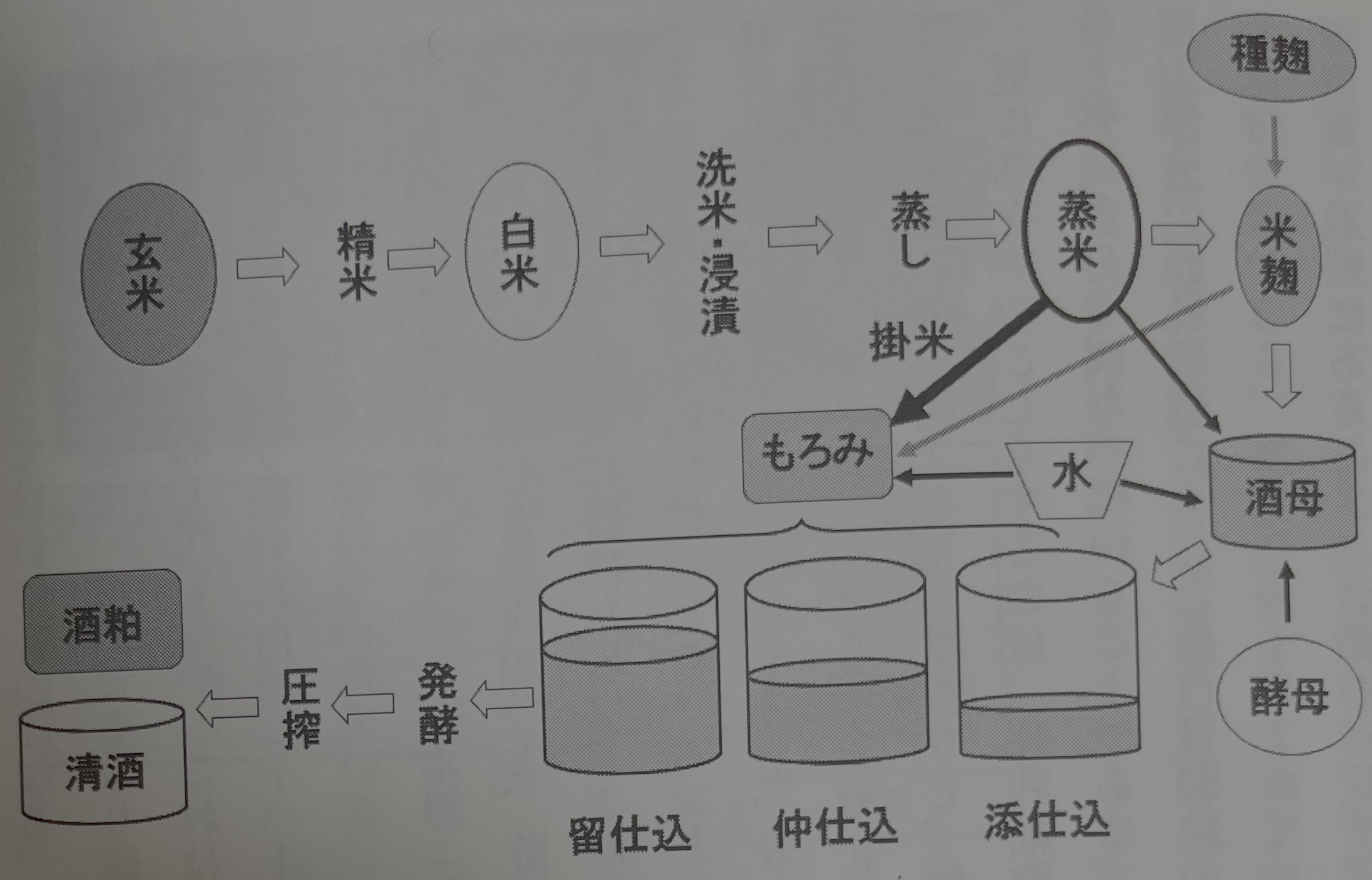 다음으로 양조 조작인데, 다량의 찐쌀과 물, 쌀누룩(앞에서 말한 것), 효모를 혼합해 누룩균의 효소로 찐쌀의 전분을 분해하여 당으로 바꾸고, 그 당을 원료로 효모가 알코올 발효하는 병행복발효법으로 만든다. 즉, 일본술의 제조 탱크 안에는 대량의 물과 찐쌀, 쌀누룩, 효모가 들어 있으며, 누룩균과 효모가 공존하면서 당화와 발효를 병행해 진행해 간다는 점에 특징이 있다. 일본주 제조의 복잡한 점은 이 공정을 3단계(4단계인 경우도 있음)에 걸쳐 확장하면서 나아간다. 이렇게 양조된 술을 짜서 청주와 술지게미로 나누고, 청주는 여과해 불넣기(살균)하고, 탱크에 저장해 병에 담아 판매된다. 일본술 제조 공정은 복잡하고 글만으로는 알기 어렵기에 그림1에 개요를 표시했으니 참조해 주길 바란다. 자, 이렇게 해서 일본술이 만들어지는데, 각 공정에서 사용되는 원료 쌀에 대해, 더 상세하게 쌀의 가공 처리와 품종의 차이 등에 대해 생각해보자.