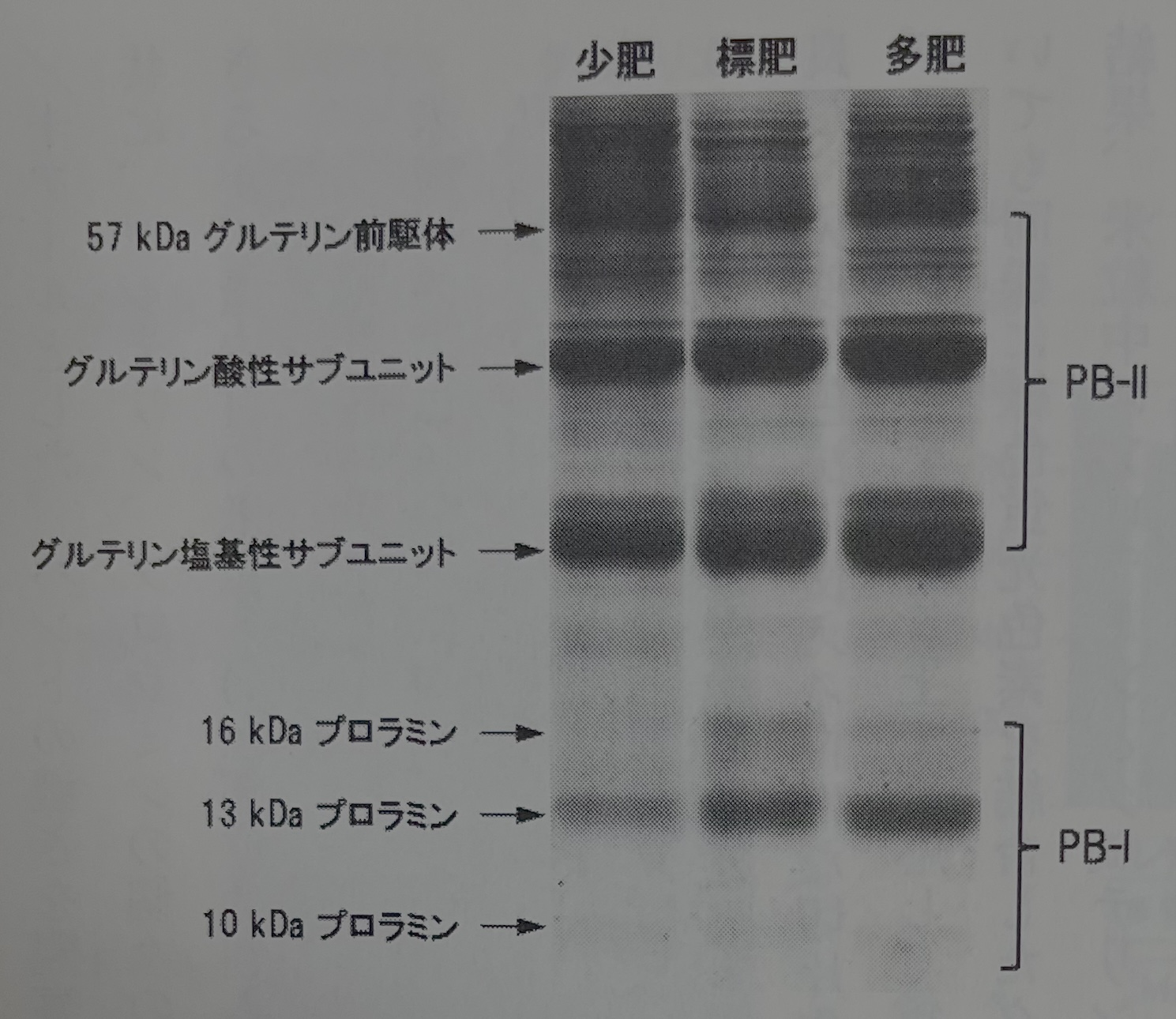 현미는 배아, 쌀겨층, 배유(쌀겨층의 안쪽 부분, 백미라고 부름)으로 구성되어 있다. 쌀 단백질에도 명칭이 붙어 있어, 물에 용해되는 단백질은 알부민, 소금 용액에 용해되는 단백질은 글로불린, 알코올에 용해되는 단백질은 프롤라민, 희산 또는 희알칼리에 용해되는 단백질은 글루테린이라 부른다. 쌀 단백질의 조성을 분석하는 데에는 쌀을 가루로 부수어 일정량의 쌀가루에서 단백질을 추출하고, 도데실황산나트륨 폴리아크릴아마이드겔 전기 영동(SDS-PAGE)법으로 분석하면, 복수의 단백질이 밴드 모양으로 관찰된다(아래 그림). 쌀의 주요 단백질은 글루테린과 프롤라민으로 구성된다. 글루테민은 분자량이 큰 순(그림의 위에서부터 순으로)으로 글루테린 전도체, 글루테린 산성 아립자, 글루테린 염기성 아립자라고 부른다. 한편, 프롤라민은 분자량이 큰 순으로 16킬로돌턴 프롤라민, 13킬로돌턴 프롤라민, 10킬로돌턴 프롤라민이라 부른다(돌턴 Da는 질량의 단위, 그림 참조). '고시히카리' 등의 표준적인 벼 품종에서는 글루테린이 60~65%, 프롤라민이 20~25%, 알부민이나 글로불린이 10~15%이다. 그림에서는 비료의 조건을 3단계로 바꾸어 재배한 '고시히카리'의 분석 사례를 보여준다. 시비량은 300평당 질소량으로 나타냈다. 이 실험에서 표준 비료 조건은 6kg/300평, 소량 비료 조건은 5kg/300평, 다량 비료 조건은 8kg/300평으로 했다. 밴드의 농도를 관찰하면, 시비량을 늘리면 쌀 단백질 전체도 증가하는 것과 함께 글루테린, 프롤라민 개개의 밴드도 증대해 나아갔다. 이 방법은 양의 변화를 간편하게 조사했는데, 단백질의 쌀알 안 국재 부위는 알 수 없었다.