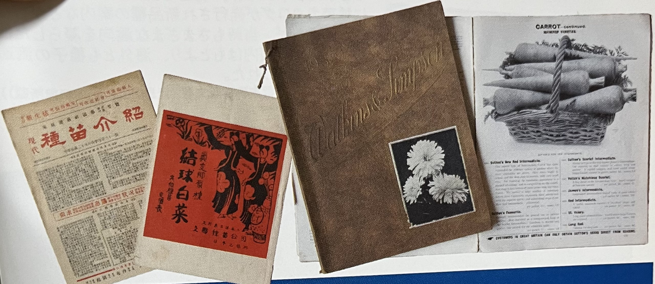 오른쪽이 영국 서튼SUTTONS 사, 중앙이 같은 왓킨슨&심슨 사의 카달로그(1932년), 왼쪽이 중국 종묘회사의 카달로그(1940년). 일본만이 아니라 외국에서 카달로그를 가져와 종자를 구입하는 종자상도 많았다.