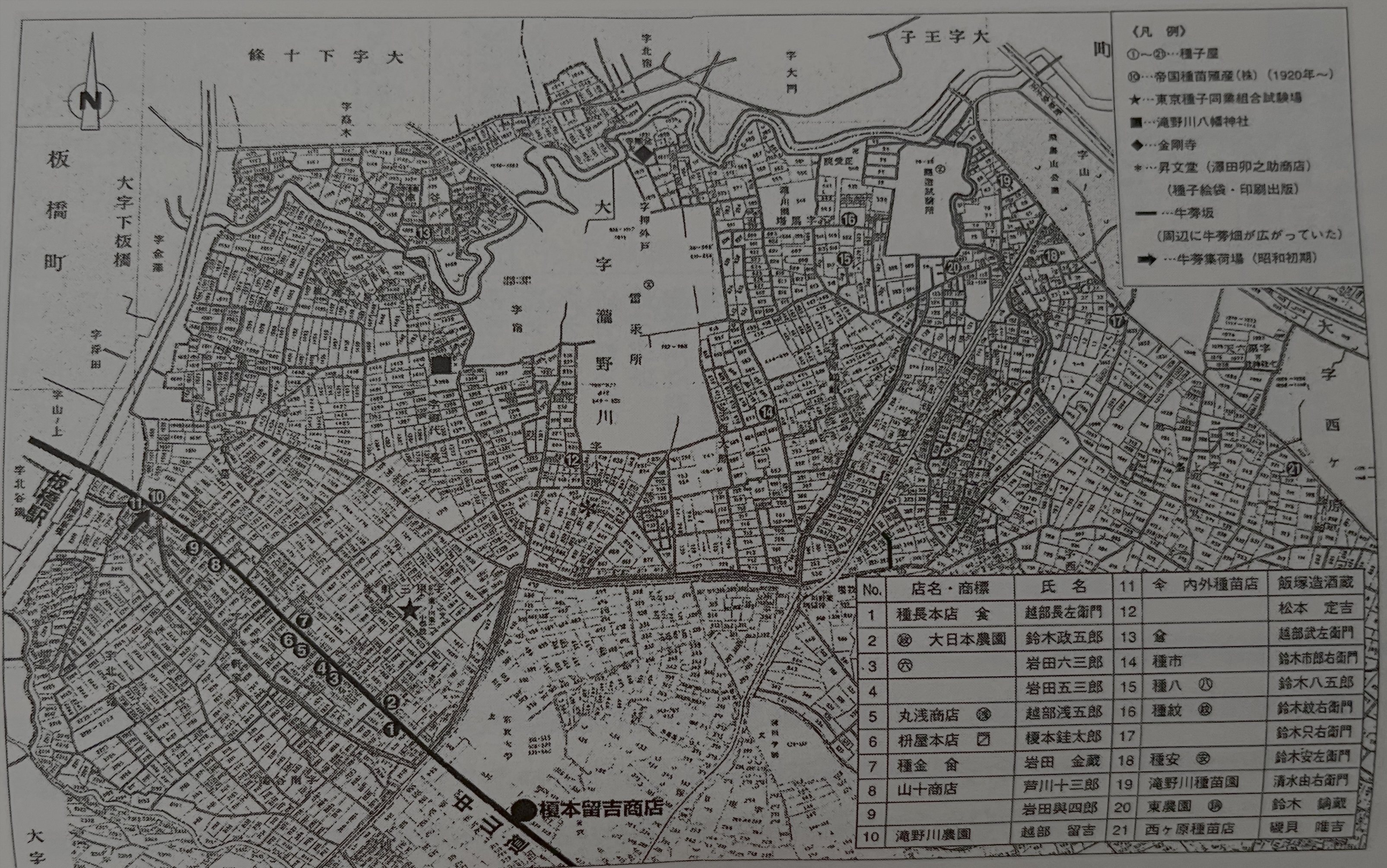 그 '종자를 판매하는 사람'의 내역을 보면, 도쿄부 안의 56%에 해당하는 18명이 키타토시마군에 집중되어 있으며, 1880년 전후에는 이미 키타토시마군이 도쿄의 채소 종자업의 중심지였던 것을 알 수 있다(표3-1). 나아가 1885년에 나카센도우를 따라 이타바시역이 개업하고, 철도 수송에 의한 채소 종자의 대량 발송이 가능해지자 에도 시대 이래의 '종자를 판매하는 사람'을 본격적인 생산·도매업자로 성장시켜 나아갔다. 다이쇼우 중기가 되면, 키타토시마군의 종자상 수는 61개까지 증가하고, 에도 시대부터 종자 매매가 성행했던 나카센도우는 통칭 '종자상 거리'라고 부르는 종자 도매 거리가 되었다(그림3-3).