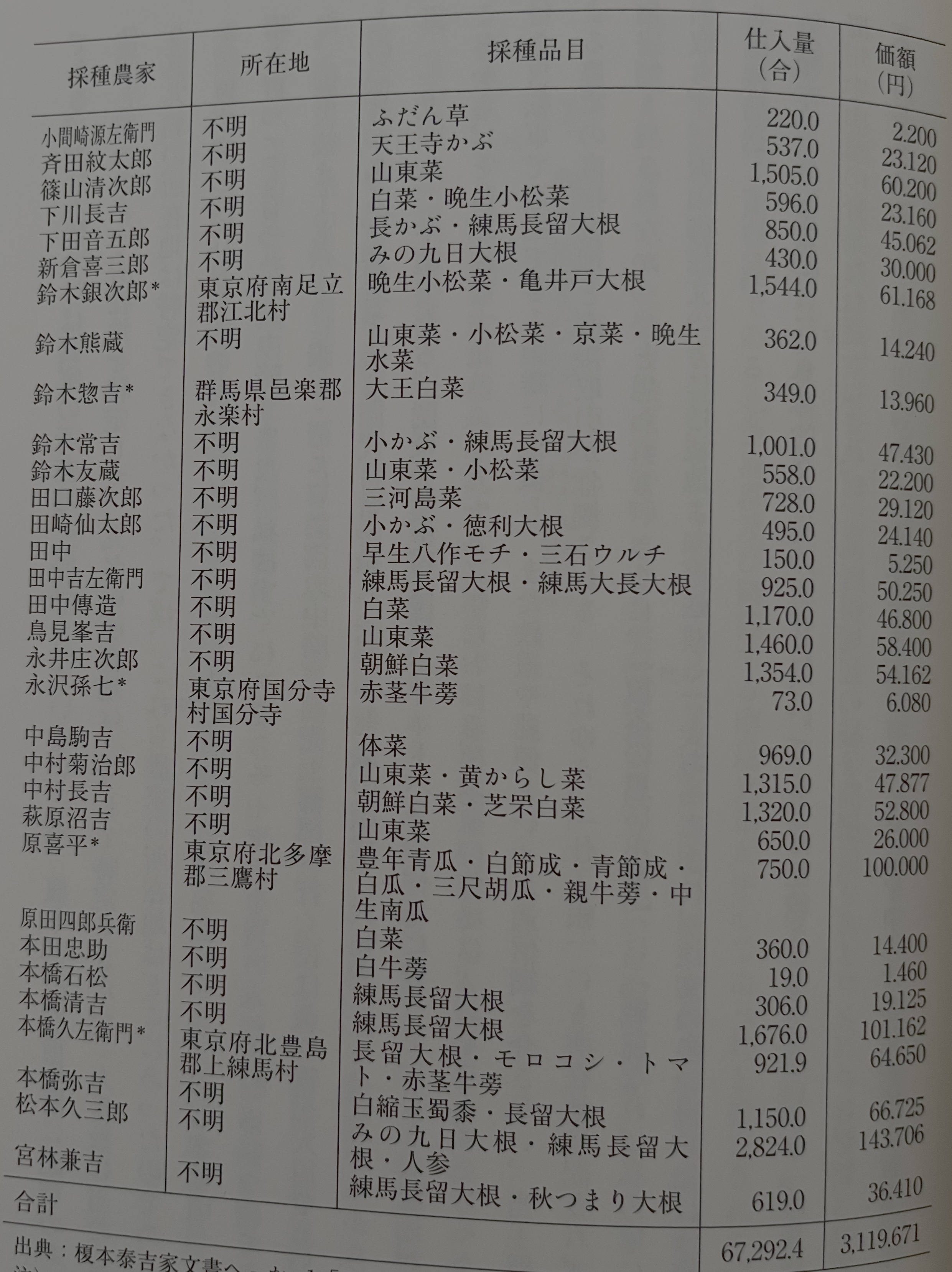 <온갖 씨앗 매입 장부(万種物仕入帳)>(이하 <매입 장부>)에 의하면, 1919년에 에노모토 집안이 채종을 위탁한 농가는 68명 있었다(표3-5). 매입 총수량은 약 67.3섬, 매입 총가액은 약 3120엔이다. 에노모토 집안의 채종 품목은 절임채 23.0섬(34%), 무 22.9섬(34%), 배추 10.7섬(16%), 당근 5.9섬(9%)이 중심이었다. 품종별로 보면, 가장 많은 생산은 네리마 나가토메 무 12.1섬(18%)이고, 다음으로 네리마 긴 무 8.0섬(12%), 산동 채 7.4섬(11%), 잎배추 6.4섬(10%), 당근 5.9섬(9%)로 이어진다. 매입은 5월부터 12월 사이에 행해지고, 6월에 집중되었다. 이것은 에노모토 집안의 채종 품목의 80% 이상을 차지하는 절임채, 무, 배추의 채종 시기가 6월이었기 때문이다.