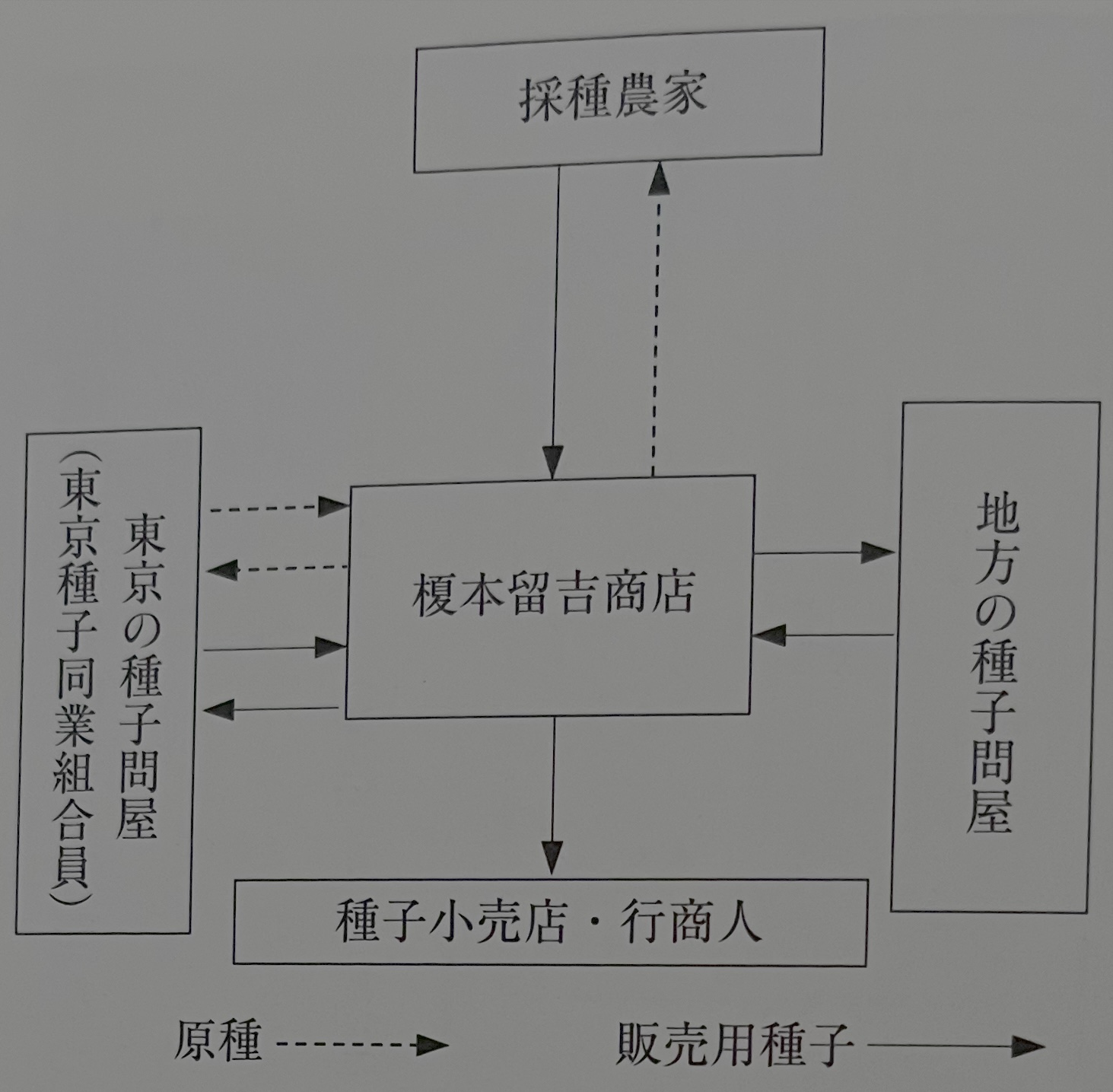 이상의 검토로부터, 에노모토 집안을 중심으로 하는 채소 종자의 생산·유통 구조를 정리하면 그림3-5와 같다. 종자 도매상은 해당 지역의 특산 종자를 위탁 채종하는 한편, 각지의 종자 도매상에게서도 종자를 구입하고, 통신 판매에 의하여 전국 각지의 종자 도매상, 종자 소매상, 행상인 등에게 판매하고 있었다.