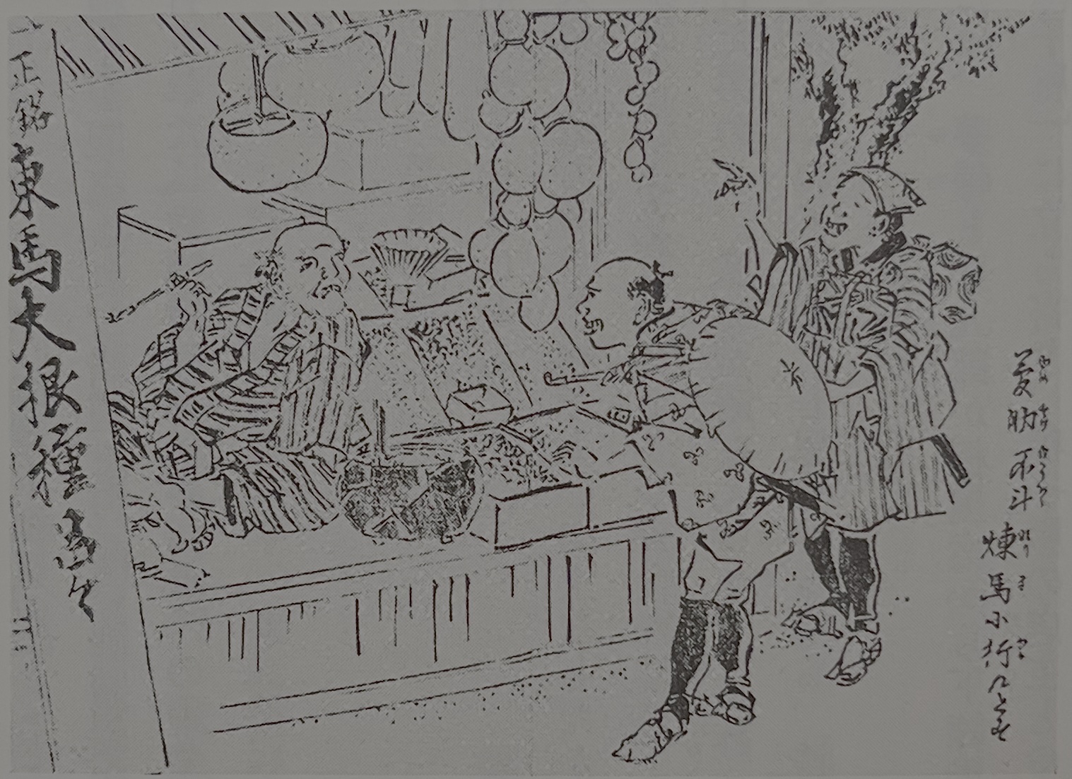 해당 지역의 채소 종자의 매매를 문헌으로 확인할 수 있는 건 1670년에 간행된 <본조통감本朝通鑑>으로, 당시 네리마·이타바시·우라와浦和가 무의 산지로 평가되었던 것에 더해, '여름 무의 씨앗'이 에도시 안에서 판매되고 있었단 것을 처음으로 볼 수 있다. 그 뒤 1735년 <속에도스나고続江戸砂子 온고명적지温故名蹟志>, 1756년 <키소지안켄 그림岐蘇路安見絵図>, 1830~1844년 <에도 명소 그림江戸名所図会>, 1842년 <동해대승양도중괴보도감東海木曽両道中壊宝図鑑>, 1847년 <교훈골계혼담몽보담教訓滑稽魂胆夢輔譚>, 1858년 <오해도중세견기五海道中細見記> 등의 문헌에 사람들의 왕래가 활발한 나카센도우中山道를 따라 있는 마을들에서 채소 종자가 판매되어, 여러 지역의 높은 평판이 기록되어 있다.(주3 각 문헌에 대해서는 키타토시마구 구립 향토자료관 編 『一粒入魂! -日本の農業をささえた種子屋』 豊島区の図録集, 2008년을 참조했다.) 사료3-1은 1847년에 간행된 <교훈골계혼담몽보담> 안에 묘사된 타키노가와무라의 '종자상' 그림이다(그림3-2).