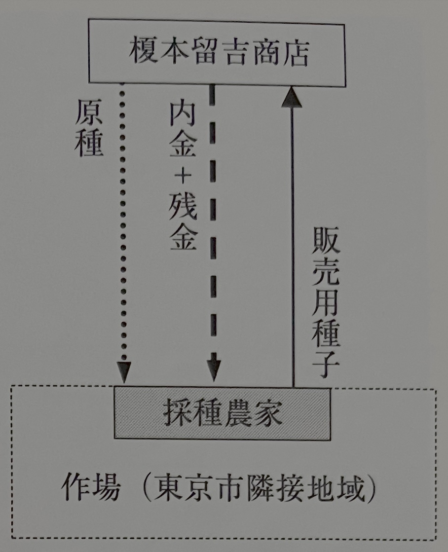 종자 도매상이 근교 농가에게 판매용 종자의 채종을 위탁하는 방법은 위탁할 때 원종과 채종 재배 비용을 선불금으로 건네주고, 채종 시기에 도쿄 종자 동업조합에서 결정된 매입 가격의 시세를 바탕으로 결제하여 잔금을 지불하는 시스템이었다(그림3-4). 그때 종자 도매상은 원종과 재배 비용 이외에도 채종 재배에 관한 기술지도를 행하여 비료 등을 위탁처의 농가에게 지급했다. 그리고 채종한 종자의 소유권은 위탁자인 종자 도매상이 독점적으로 매수하는 계약이었다고 한다.(주21 鞍田純 「日本に於ける蔬菜種苗業の実態」 「農業総合研究』 3 (1), 194년, 195쪽. 또한 日本種苗生産業会 編 『種苗界』 4월호, 1950년에 의하면, "도쿄의 도매상은 파종한 뒤, 떡잎 시기 무렵에는 잎 모양에 따른 다른 계통의 제거를 지도하고, 모본의 선발 시기에는 직접 모본 선발에 입회하며, 추대 시기나 개화 시기에는 다시 잎 모양이나 꽃의 색이나 모양에 따른 다른 계통의 제거를 지도하고, 아울러 수량의 예상을 행하며, 결실하면 집하・매수를 행하는 등 몇 번이나 채종 농가를 순회 지도하면서 위탁한 종자의 증식 과정을 보고 채종 기술을 지도하고, 우수한 종자의 생산에 노력했다"고 한다.)