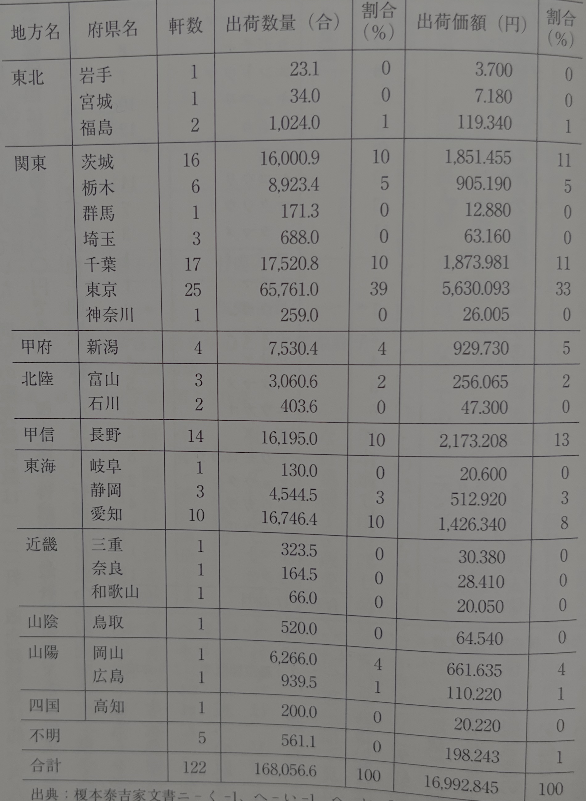 부현별 판매 수량을 보면, 도쿄의 65.8섬이 판매 총수량의 40%를 차지하고, 다음으로 치바 17.5섬(10%), 아이치 16.7섬(10%), 나가노 16.2섬(10%), 이바라키 16.0섬(10%)이다. 판매 수량에서도 도쿄를 필두로 거래처 수가 많은 치바, 아이치, 나가노, 이바라키에서 약 80%를 차지하고 있었다. 같은 해의 판매처 총 수는 122곳, 판매 총수량은 약 168.1섬, 판매 총가액은 약 1만 7000엔이었다. 에노모토 집안의 단골 거래처는 최종 소비자인 채소 생산 농가에게 직접 판매가 아니라, 각지의 종자 도매상, 종자 소매점, 행상인 등에게 판매하고, 종자 소매상이나 행상인 들을 통하여 채소 생산 농가에게 판매되었다. 소매상에게서 농가로의 판매에 대해서는 5장에서 상세히 소개하겠다.