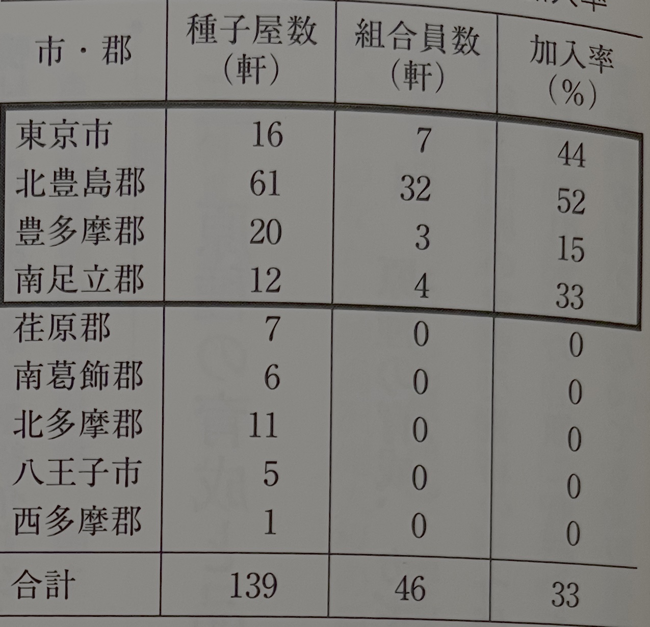 성장하는 종자 도매상이 늘어나는 가운데 1894년에는 키타토시마군 안의 종자 도매상 45명에 의하여 '농산물 도매 조합'(주8 東京府 『東京府の産業(農業)』 其の一 園芸, 東京府, 1929년, 123쪽.)이 결성되어 이를 모체로 1916년에는 '도쿄 종자 동업조합'이 설립된다. '농산물 도매 조합'의 실태에 대해서는 알 수 없는 점이 많지만, 1906년 7월 가을 길고 둥근 끝부분(秋長丸尻), 가을 크고 긴 끝부분(秋大長尻), 도쿠리 미야시게(徳利宮重), 9일 무(九日大根)의 결산 시세 '정定'(주9 榎本泰吉家文書 ナーあー23-31(豊島区立 郷土資料館 소장))나, 1909년 6월의 미카와시마三河島 채菜, 잎배추(体菜), 산둥山東 채, 배추, 교토 채, 긴 순무, 텐노우지天王寺 순무의 원종 결산 시세 '정定'(주10 榎本泰吉家文書 カーこー16(豊島区立 郷土資料館 소장)), 1912년 8월의 당근 씨앗 '결산 시세'(주11 榎本泰吉家文書 へ-あ-35-63(豊島区立 郷土資料館 소장)) 등의 사료가 약간이지만 남아 있어, 키타토시마군의 종자 도매상이 조합을 만들어 판매용 종자나 원종(친종親種)의 가격을 책정하던 모습을 엿볼 수 있다. 이것은 메이지 중기 이후의 종자 수요 확대에 의해 자가채종만으로는 수요에 대응하지 못하여 근교 농가에게 위탁 채종이 일반적이 되었던 결과, 위탁처인 농가에게서 종자를 집하할 때 종자 가격을 책정할 필요가 생겼던 것을 의미한다.1913년이 되면 도쿄시·키타토시마군·미나미아다치군南足立郡·토요타마군豊多摩郡의 네 지역에서 종자 판매 수량은 1만 2000섬에나 달하고, 그 판로는 국내에 그치지 않고 대만이나 조선 등 여러 외국에까지 확대되었다(표3-2). 이러한 상황 아래, 1900년에 공포된 중요 물산 동업조합법에 기반한 조합으로서 1916년 2월에 도쿄시, 키타토시마군, 미나미아다치군, 토요타마군을 조합 지구로 한 '도쿄 종자 동업조합'이 설립되었다.(주12 도쿄 종자 동업조합의 설립 경위에 대해서는 横山恵美 「東京種子同業組合の設立経緯と活動内容について」 豊島区立 郷土資料館 編 『生活と文化』 (17) 豊島区 教育委員会, 2008년을 참고하길 바란다.) 같은 시기 도쿄부 안의 종자업자는 139명이며, 이 가운데 조합 지구 안의 종자상 수는 109명으로 조합원은 46명이었기 때문에 수치상의 가입률은 약 40%이다(표3-3). 그러나 조합 지구 안의 종자상 수의 수치에는 종자 소매상이나 종자 생산자 등도 포함되어 있는 것도 상정되기 때문에, 아마 대부분이 이 조합에 가입해 있었을 것이라 생각된다.(주13 横山恵美 「東京種子同業組合の設立経緯と活動内容について」 豊島区立 郷土資料館 編 『生活と文化』 (17) 豊島区 教育委員会, 2008년, 21쪽.)