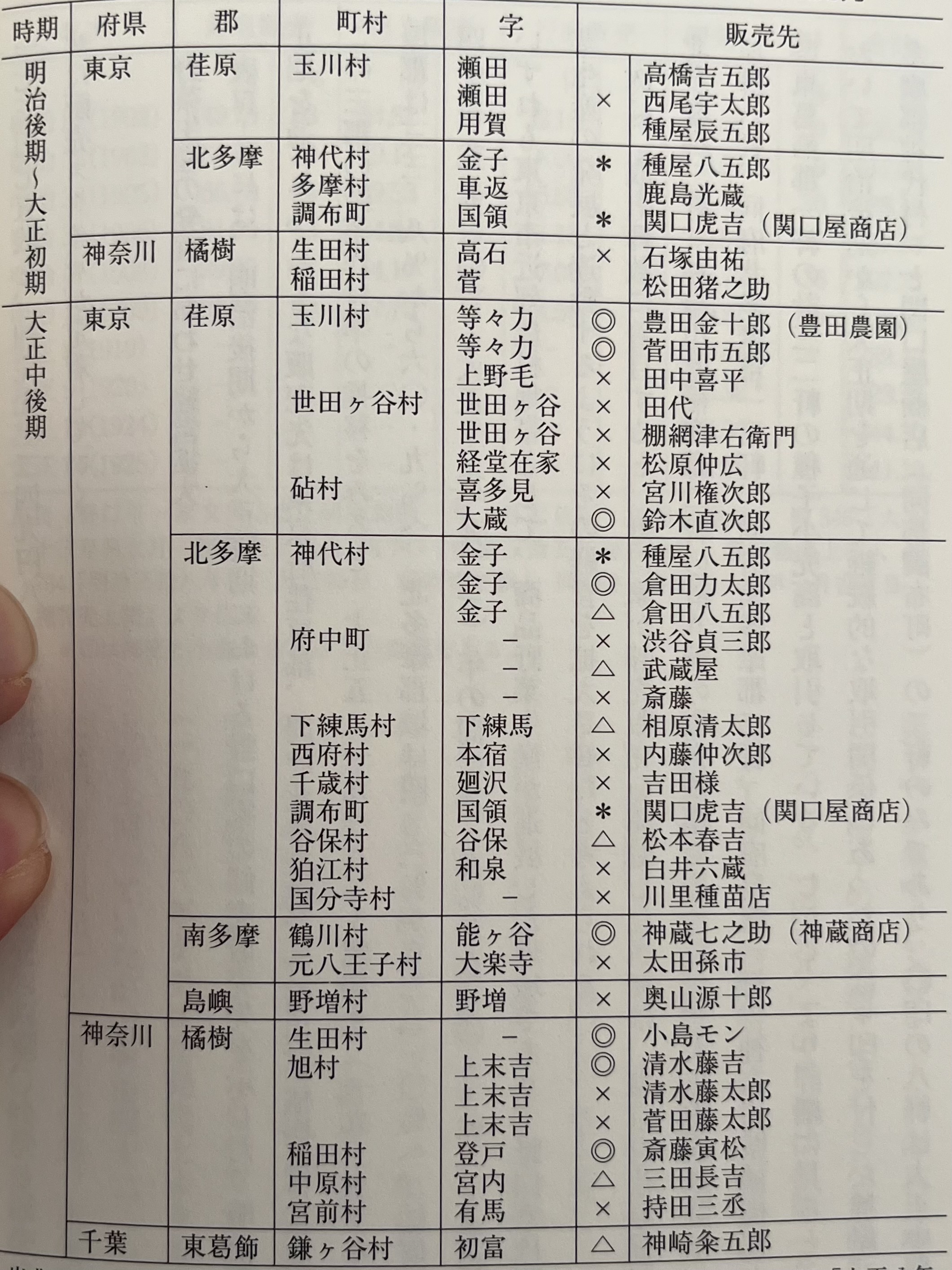 표4-8에는 메이지 후기부터 다이쇼우 후기에 노구치 집안의 도매 판매처를 나타냈다. 메이지 후기부터 다이쇼우 시기를 통하여 주요 판매처는 도쿄부 에바라군荏原郡, 같은 부 키타타마군, 카나가와현 타치바나군橘樹郡에 집중되었다. 이 세 군의 채소 작부율 추이를 보면, 1916~1935년 사이에 에바라군은 33.8%에서 60.9%로, 키타타마군 지역은 4.3%에서 22.0%로, 타치바나군은 1910~1922년 사이에 8.9%에서 20.1%로 급증한다.(주26 坂井勉三 「都市近郊地帯の農業 -東京の記録-」 大明堂, 1984년, 18-20쪽 및 大豆生田稔 「農業技術の普及と農会組織の形成 -明治中後期の橘掛郡-」 横浜 近代史 研究会・横浜 開港 資料館 編 『横浜近郊の近代史 ー橘(郡にみる都市化・工業化』 日本経済評論社, 2002년, 135쪽.) 모두 도쿄시 근교 농촌 지대로서 상품 채소 생산이 진전된 지역이고, 노구치 집안은 판매처인 채소 생산의 발전과 연동하듯이 그 경영을 확대시켰다고 생각할 수 있다.