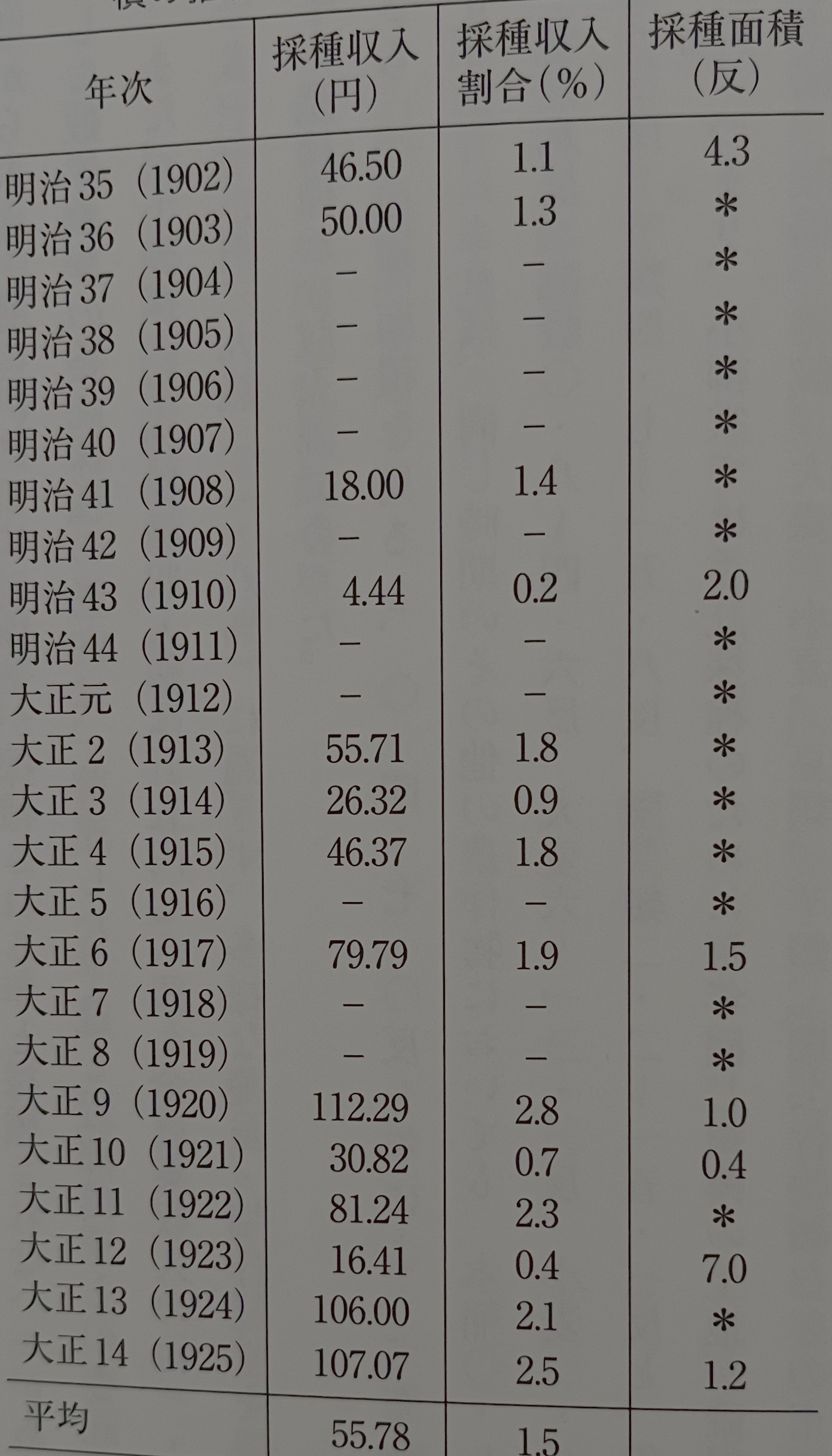 표4-5에는 1902년부터 1925년에 걸쳐서 오야나기 집안의 채종 수입 내역과 전체 농업 수입에서 채종 수입의 비율 및 채종 면적의 추이를 나타냈다.