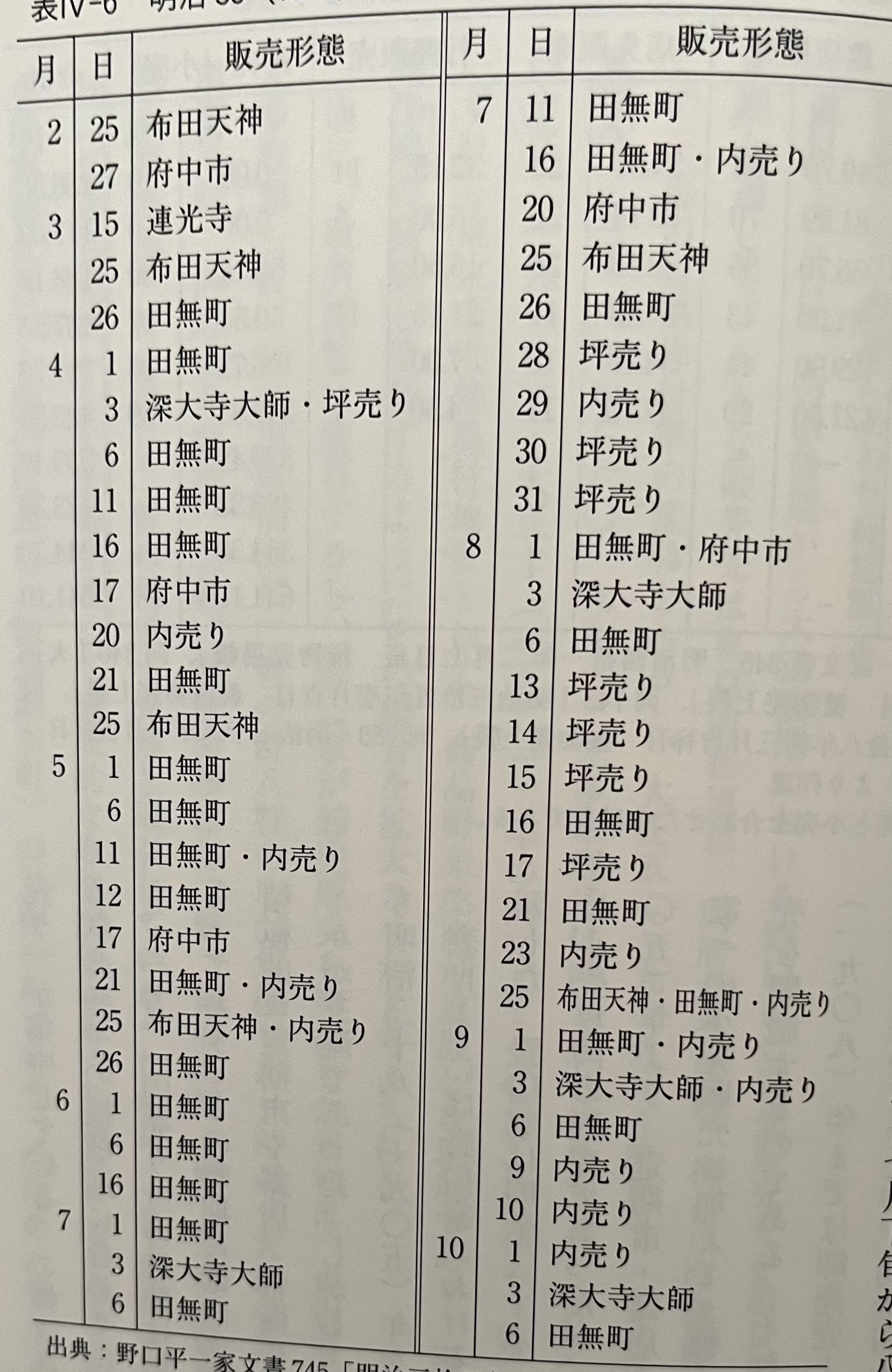 노구치 집안은 채종 관리인을 맡는 한편, 타치바나야 종묘점으로서 종자 판매업의 기능도 담당했다. 노구치 집안 문서 안에 종묘업에 관한 가장 오래된 사료인 <종자 매입 장부(種物仕入帳)>(주24 野口平一家文書 647 「種物仕入帳」 (明治25~35年).)에 의하면 1889년에 키타토시마군 타키노가와무라의 종자 도매상인 스즈키 이치로우에몬에게서 '네리마 나가루長留 무 5되, 미가와시마채 2되, 긴 순무 6되, 늦가을 무 1되, 9일 무 1되'의 종자를 구입한 것이 처음 보인다. 즉, 노구치 집안에서는 채종 관리인이 되기 전부터 소규모로 종자 판매에 착수하고 있었던 것이다.표4-6에는 1902년 노구치 집안의 연간 판매 주기를 나타냈다. 이 시기의 판매 스타일은 노점이나 정기 시장에서 판매하는 것에 더해, '내부 판매(内売り)'라고 부르는 가게에서의 소매나 '평당 판매(坪売り)'라고 부르는 죠우후마치와 그 주변의 단골 거래처로의 행상이었다. 전술했듯이, 노구치 집안은 노점상 집단의 우두머리를 맡고 있어, 세력 범위인 키타타마군 죠우후마치의 후다텐진布田天神・진다이지深大寺나 세력권 밖의 후츄우시府中市의 오쿠니타마大国魂 신사神社・렌코우지連光寺의 제례에서 노점으로 종자를 판매했다. 나아가 타나시쵸우田無町나 후츄우시에서 개최되었던 정기 시장에서 연간 32일 정도 종자를 판매했다. 매월, 후츄우에서는 1, 7일에(7월 20일은 스모모 마츠리李子祭), 타나시에서는 1, 6일에 정기 시장이 열렸다.(주25 府中市史編さん委員会 編 『府中市史』 下巻, 府中市, 1974년, 1070・1252쪽 및 田無市 企画部 市史編さん室 編 『田無市史』 第4巻 民俗編, 田無市, 1994年, 558쪽.) 그중에서도 타나시쵸우의 정기 시장으로의 출점이 가장 많아, 그 출점일수는 연간 28일이었다. 또한 7월 하순부터 8월에 걸쳐서는 '평당 판매'가 집중된다. 이것은 8월 하순부터 시작되는 가을 파종 종자의 파종기에 맞춘 행상 행동인 듯하다. 한편, '내부 판매'의 일수는 연간 13일 정도가 되어, 이 시기에는 가게 앞 판매보다도 스스로 적극적으로 정기 시장이나 노점, 행상에 나가는 판매 스타일이 주류였다. 그러나, 그 판매 스타일도 1905년을 경계로 일변한다.