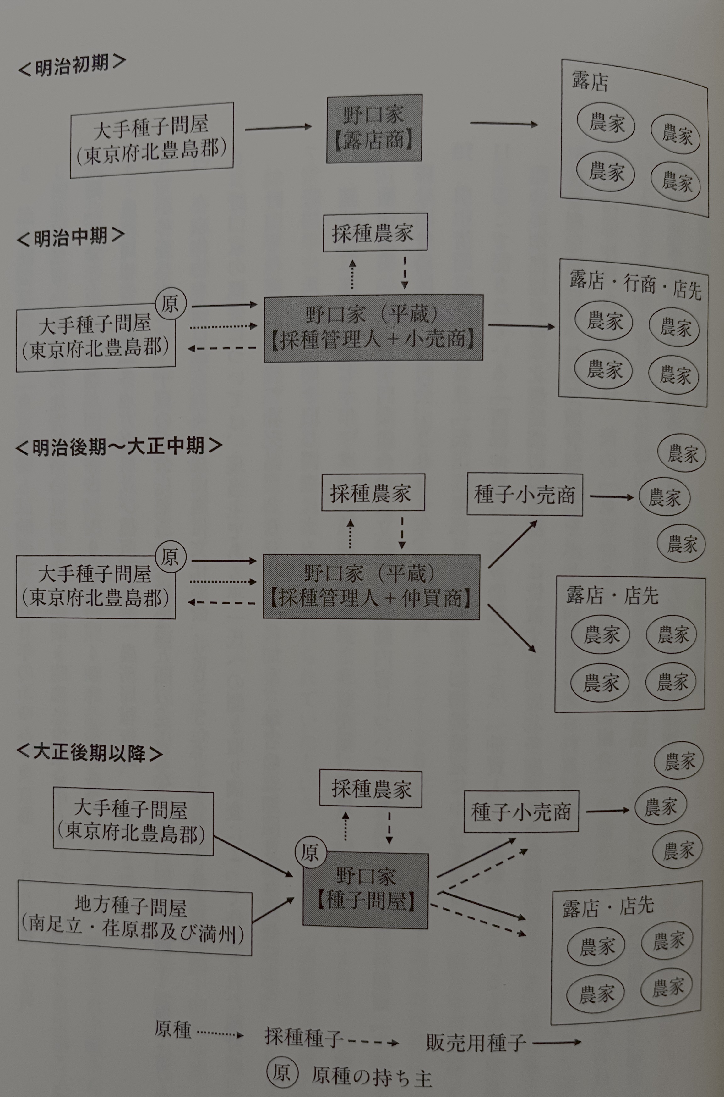 이상의 검토로부터, 노구치 집안의 경영 전개를 정리하면 그림4-3과 같다. 키타토시마군의 종자 도매상의 지점 같은 기능을 담당했던 노구치 집안이 다이쇼우 시기 이후에 자기 가게에 의한 위탁 채종과 다른 지역의 종자 도매상에서 종자를 매입해 도매 판매해 나아가는 과정은 키타토시마군의 종자 도매상으로부터 자립을 도모해 채종 관리인에서 지방 종자 도매상으로 성장해 나아가는 것을 보여준다.