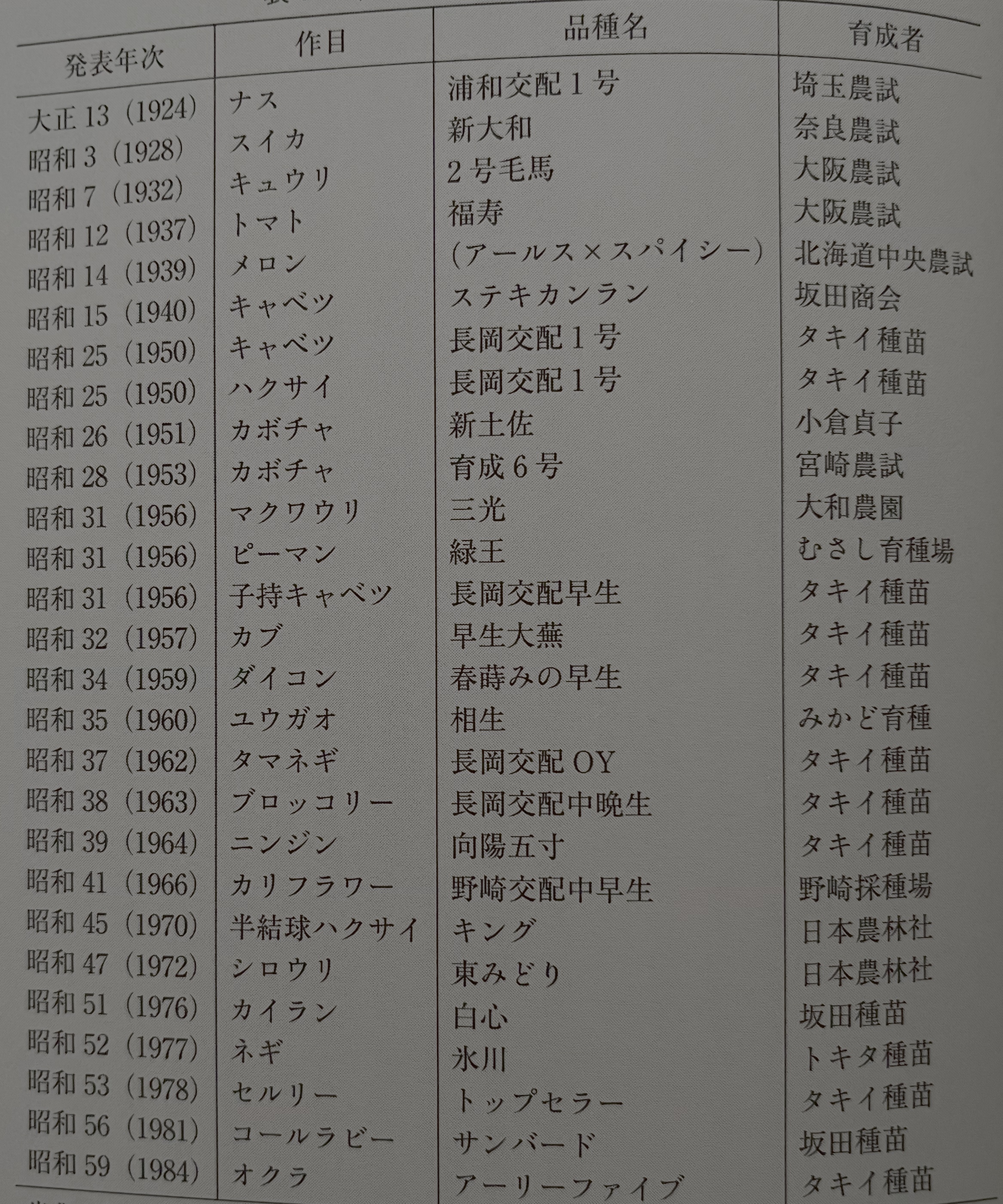 채소에서는 1924년에 사이타마현립 농사시험장이 인공 교배에 의하여 가지의 F1 품종 '우라와浦和 교배 1호'를 육성한 것이 시작이다. 이후 표1처럼 1928년에는 수박, 1932년에는 오이, 1937년에는 토마토, 1939년에는 멜론, 1940년에는 양배추 등 태평양전쟁 전기에도 이미 많은 F1 품종이 발표되었다. 또한, F1 품종의 육성자를 보면, 1940년을 경계로 그 이전에는 대부분 공립 시험장에서 육성된 것에 반해, 그 이후는 대부분이 민간의 종묘회사에서 육성되는 것을 알 수 있다. 즉, 일본에서 F1 품종의 육성은 지방 농사시험장이 선행한 것이다. 이는 전술한 지방 농사시험장을 중심으로 결성되었던 채종 조합이 관계된다고 생각할 수 있다(4장 칼럼 참조). 채종 조합의 결성은 종자의 품질 문제에 대응한 것으로, 그곳에서는 원종의 개량이 진행되었다. 즉, 시험장에서는 대부분의 우량 원종이 모여 있었던 것이다. 그 풍부한 원종을 이용해 F1 품종의 시험 연구로 발전했다고 생각한다. 그러나 이들 F1 품종은 그 진가를 인정받지 못하고 태평양전쟁에 휘말려 시장에 출회되지 못하고 끝나 버렸다고 한다.
