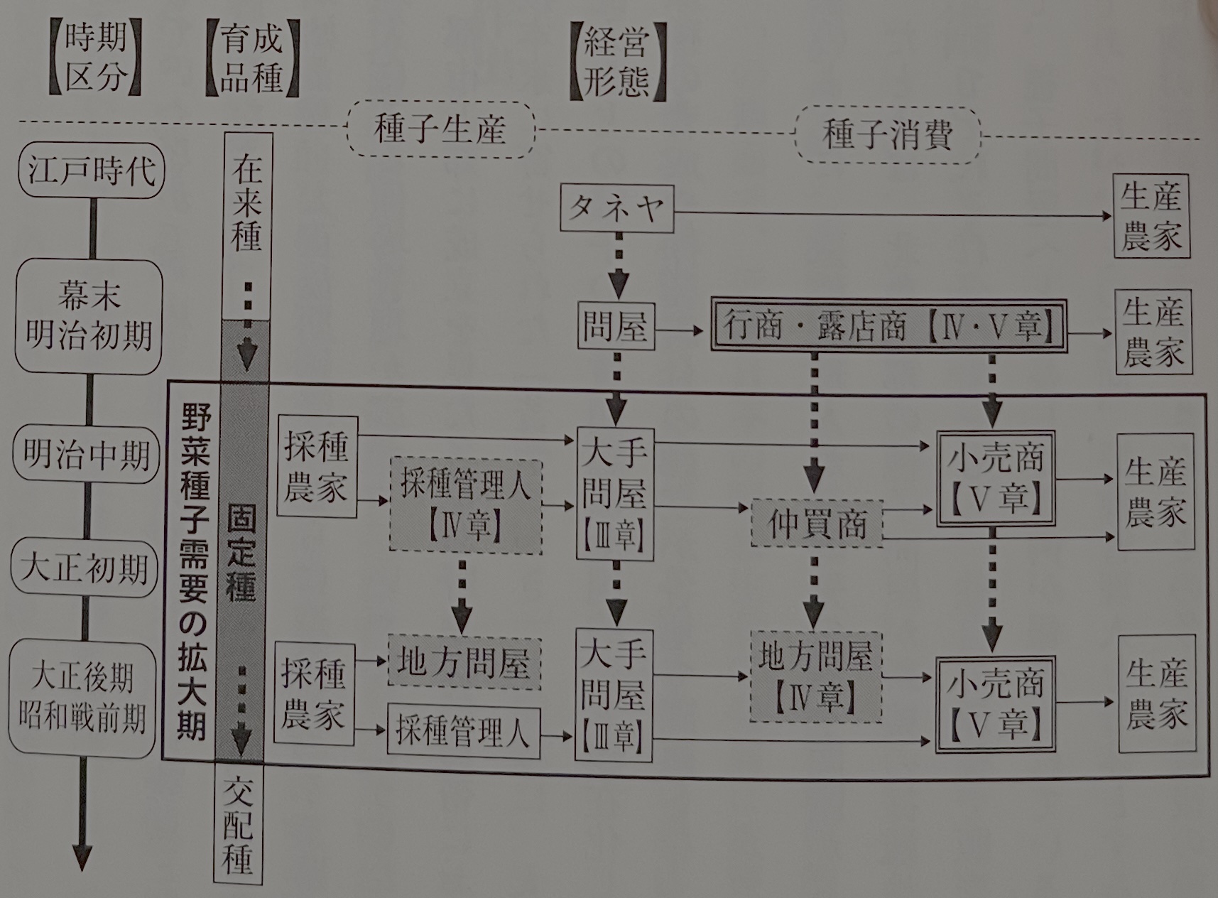 이상, 각 장에 나오는 종자상의 경영 전개를 정리하면 표 6-1, 그림 6-1과 같다. 종자상의 본연의 자세는 각 시대의 채소 생산 발전에 반영되어, 시대별로 특징을 볼 수 있다. 메이지 초기까지 종자상은 농업을 주로 하며 일정한 시기에만 종자를 판매하던 사람이 많아, 직접 채종하는 가운데 잉여분 종자를 판매해 생산부터 판매까지 한 곳에서 대응했다. 그러나 메이지 중후기 이후 종자 수요가 증대·다양화되는 과정에서 종자의 생산부터 소매까지를 단독으로 담당하는 종자상은 예외적이 되어 종자의 생산·유통 과정에 분업 체제가 구축되었다. 즉, 생산면에서는 도매상에 의한 근교 농가로의 위탁 채종과 채종 관리인에 의한 원격지의 채종 관리 체제가 확립되었고, 유통을 뒷받침한 행상과 노점상은 점포를 마련해 소매상·중개상, 나아가 지방 종자 도매상으로 본격적으로 발전해 나아갔다. 도시 지역의 대형 종자 도매상을 정점으로 한 종자 중개상·종자 소매상·지방 종자 도매상이라는 기능의 분화가 진전된 것이다. 그때, 통신 거래를 재빨리 도입한 종자업계는 전국적인 종자상 연결망을 형성해 신속하고 대량의 종자 유통을 실현시켰다.