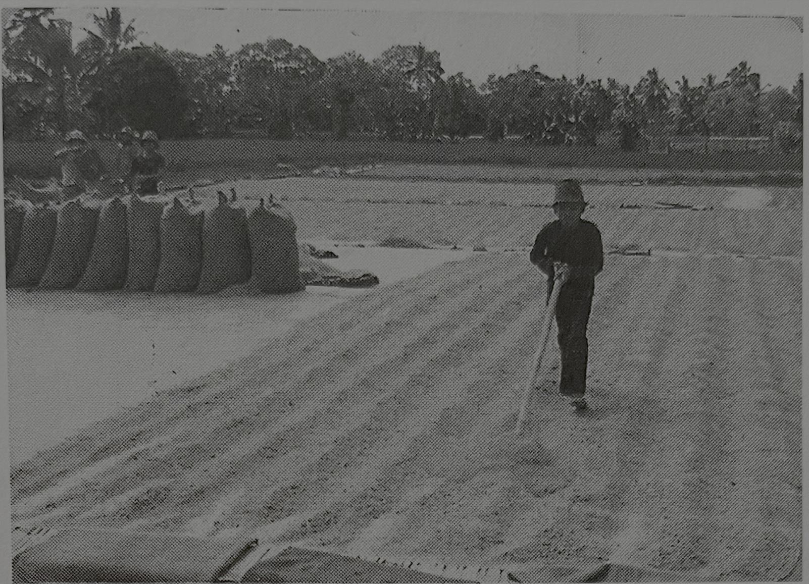 이러한 나락의 건조법, 곧 '나락의 건조는 급격하지 않고 천천히 하는 쪽이 좋다'라는 것은 상업 정미소의 기술자에게는 옛날부터 알려져 있는 것이다. 그래서 상업 정미소의 빈틈없는 경영자는 수확기에 농가로부터 일부러 덜 건조한 나락을 싸게 매집한다. 그리고 그 나락을 정미소의 넓은 포장 광장에 두텁게 펼쳐서 고용한 인부에게 끊임없이 뒤섞도록 시키고, 위에 기술했듯이 전체를 균일하게 천천히 건조한다(그림30). 이렇게 해서 건조한 나락에서는 농가에서 급속히 건조한 나락에서보다도 훨씬 싸라기가 적은 백미를 높은 비율로 얻을 수 있다.