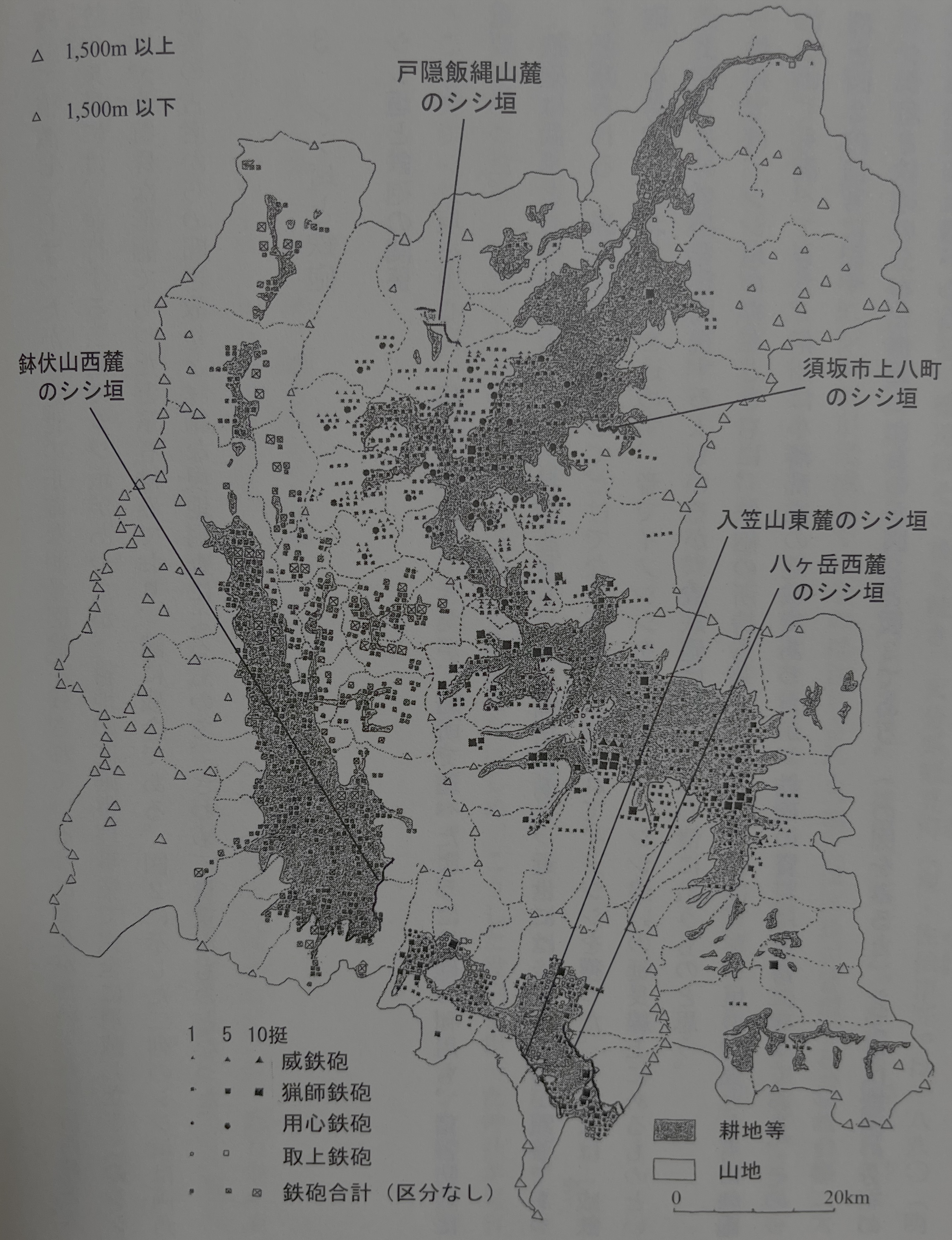 신슈에서는 짐승막이담의 존재와 함께, 철포의 소지도 두드러졌다. 필자는 짐승막이담의 조사와 함께 철포에 대해서도 조사해 왔다. 신슈는 작은 번이 난립한 지역이었는데, 철포의 자료는 풍부하게 남아 있어 그 일부를 그림2의 비고에 기록한다.