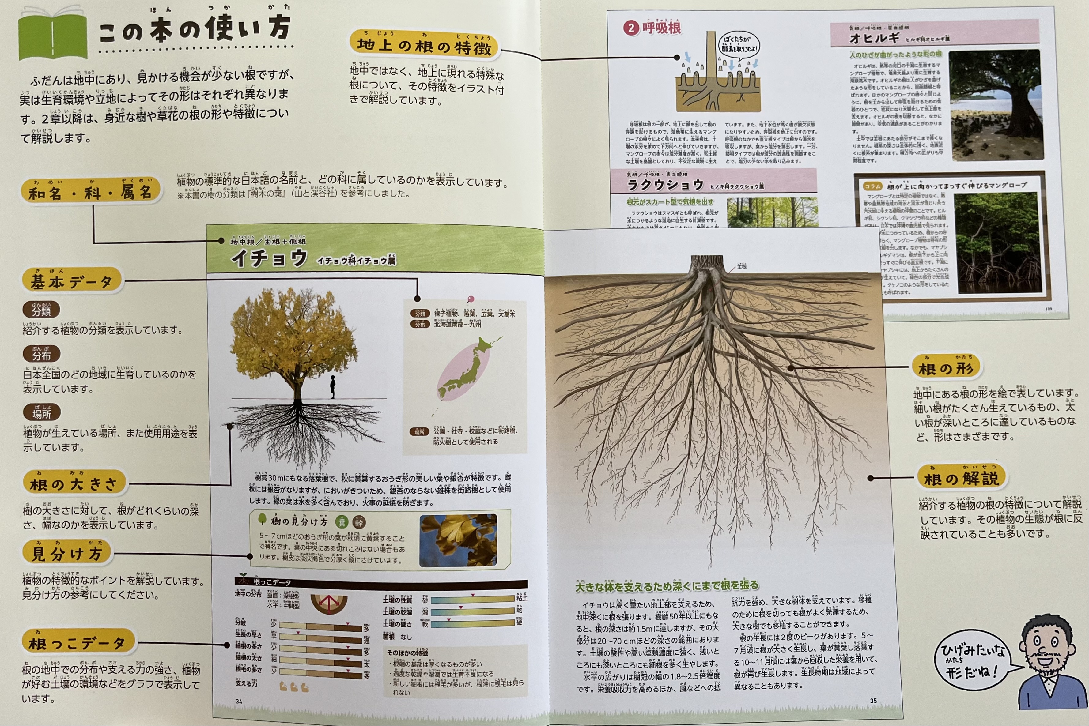 계절마다 아름다운 꽃을 피우는 풀과 꽃이나 나무들, 식재료나 목재를 기르는 작물이나 수목 등, 우리들은 많은 식물에 둘러싸여 생활하고 있습니다. 이들 식물은 지하에 뿌리를 뻗고서 버티고 있습니다. 그러나 뿌리는 흙 속에 있기 때문에 평소 별로 눈에 띄지 않지요. 이 <뿌리 도감>은 흙 속에 숨어 있는 뿌리의 모습이나 그 역할에 대해 소개합니다.