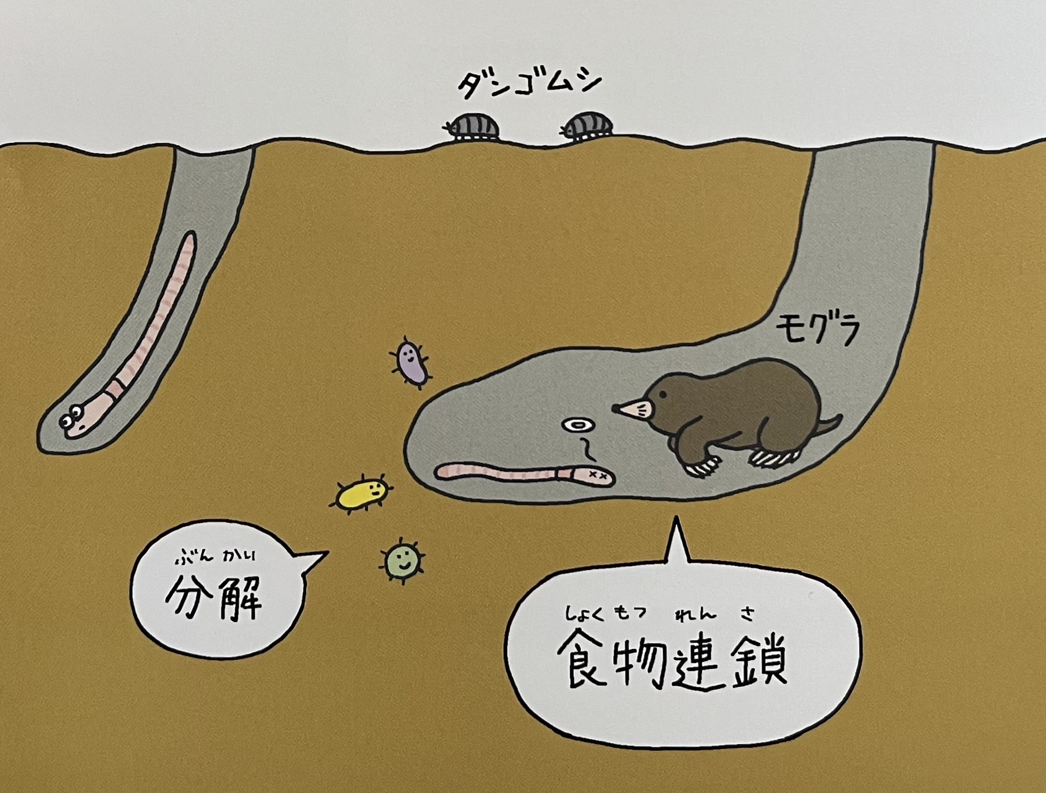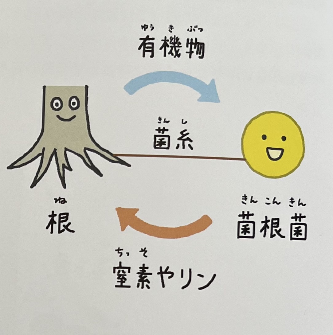 뿌리 주변의 생물은 마른 잎이나 낙엽, 죽은 뿌리 등을 먹이로 삼아 살아가거나, 더 작은 생물을 먹거나 하며 살아가는 것도 있습니다. 이들 생물은 식물의 뿌리로부터 영양만 받는 것이 아니라, 생물의 똥이나 사체가 미생물에 의해 분해되어 식물의 영양이 되고 있습니다. 예를 들면, 낙엽을 먹는 공벌레의 똥이나 사체는 곰팡이나 미생물에 의해 분해되어 최종적으로 흙 속의 뿌리에 영양으로 흡수됩니다.