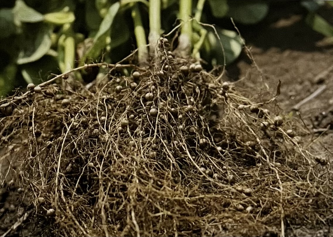 대두 등의 콩과식물은 토양 속에 살고 있는 뿌리혹박테리아라는 세균과 공생합니다. 이름 그대로 뿌리에 기생하며 둥근 알 모양의 혹을 만듭니다. 뿌리혹박테리아 공생은 5000만 년 전에 균근균과의 공생 구조를 일부 사용하며 시작되었습니다. 뿌리혹박테리아는 숙주 식물이 내놓는 플라보노이드라고 부르는 물질을 감지하면 뿌리혹 형성 인자를 만들어 뿌리로 돌려보냅니다. 그 뒤, 뿌리혹박테리아가 뿌리털의 끝에 거두어져 뿌리로 들어갑니다. 감염 부위는 뿌리혹이 되어 공기 중의 질소 가스를 암모니아로 바꾸어 숙주 식물을 부양합니다.