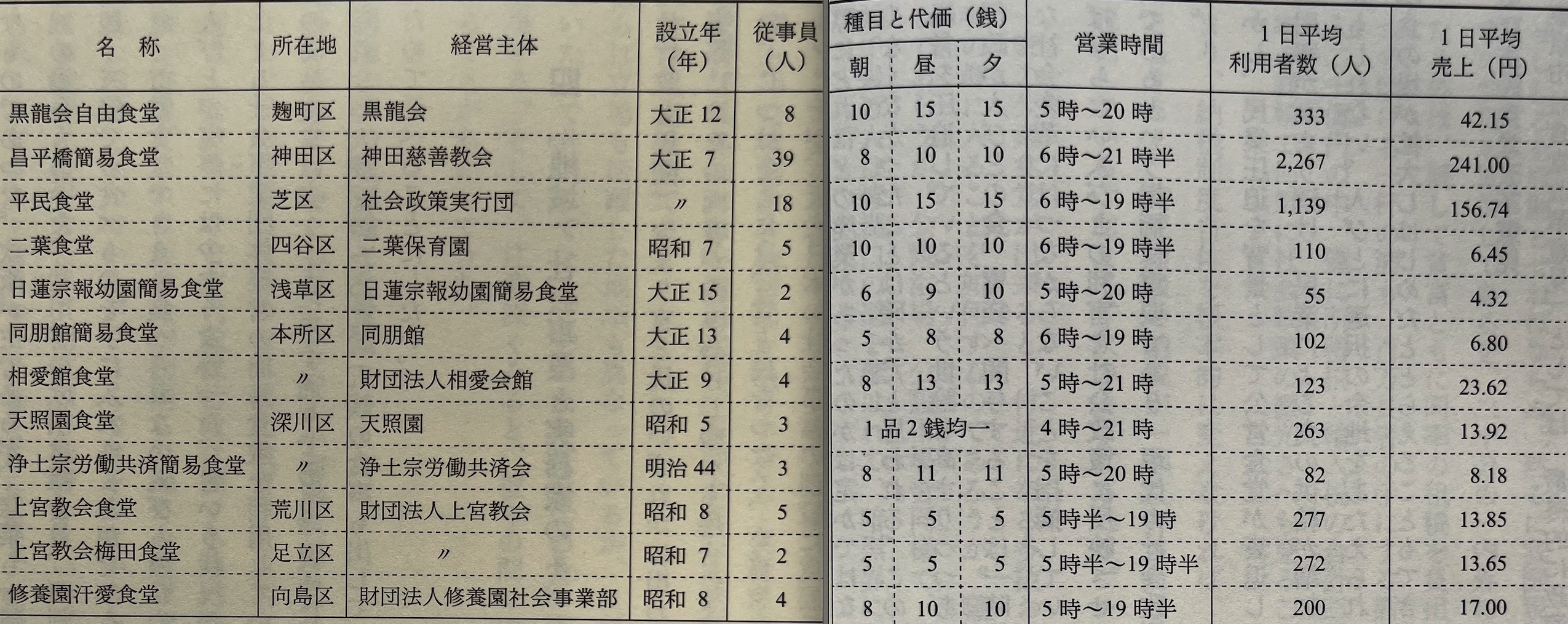 출처: 도쿄시 사회국社会局 편編 「市設食堂経営策に関する調査 一附,東京市設食堂改革意見』 東京市 社会局, 1936년, 1-3쪽에서 작성.