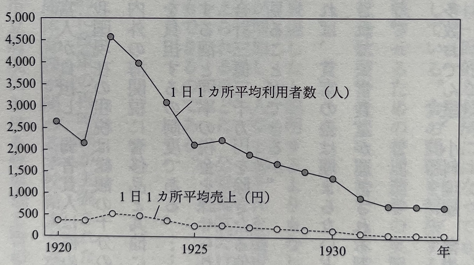 쌀 소동에 대한 대응, 칸토우 대지진의 부흥 사업이란 의미를 부여하면서 한때는 성황이었던 시영 식당이었지만, 그 뒤는 이용자가 감소해 폐쇄가 잇달았다. 도쿄시에서 1920년부터 1934년의 식당 이용자 총수와 하루 1개소 평균 이용자 수의 추이를 그림 2-7, 그림 2-8에 나타냈다. 이용자 총수는 1928년, 평균 이용자 수는 1922년을 정점으로 이후 감소의 일로를 걷고 있다. 이와 같은 상황에서 도쿄시는 1934년에 「시설 식당 경영책에 관한 조사 -부록, 도쿄 시설 식당 개혁 의견(市設食堂経営策に関する調査 -附、東京市設食堂改革意見)』(24)을 간행했다.